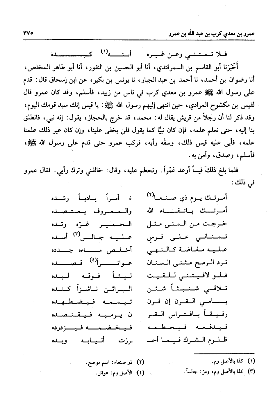 فلا تمتني وعن غيره * أبنه (1) كبده * أخبرنا أبو القاسم بن السمرقندي أنا أبو الحسين بن النقور أنا أبو طاهر المخلص أنا رضوان بن أحمد نا أحمد بن عبد الجبار نا يونس بن بكير عن ابن إسحاق قال قدم على رسول الله (صلى الله عليه وسلم) عمرو بن معدي كرب في ناس من زبيد فأسلم وقد كان عمرو قال لقيس بن مكشوح المرادي حين انتهى إليهم رسول الله (صلى الله عليه وسلم) يا قيس إنك سيد قومك اليوم وقد ذكر لنا أن رجلا من قريش يقال له محمد قد خرج بالحجاز يقول إنه نبي فانطلق بنا إليه حتى نعلم علمه فإن كان نبيا كما يقول فلن يخفى علينا وإن كان غير ذلك علمنا علمه فأبى عليه قيس ذلك وسفه رأيه فركب عمرو حتى قدم على رسول الله (صلى الله عليه وسلم) فأسلم وصدق وآمن به فلما بلغ ذلك قيسا أوعد عمرا وتحطم عليه وقال خالفني وترك رأيي فقال عمرو في ذلك * أمرتك يوم ذي صنعاء (2) * أمرا باديا رشده أمرتك باتقاء الله * والمعروف يعتصده خرجت من المنى مثل * الحمير غره وتده تمناني على فرس * عليه جالس (3) أسده عليه مفاضة كالنهي * أخلص ماءه جدده ترد الرمح مثنى السنان * عوائرا (4) قصده فلو لاقيتني للقيت * ليثا فوقه لبده تلاقي شنبثا شثن * البراثن ناشزا كنده يسامي القرن إن قرن * تيممه فيضطهده رفيقا بافتراس القرن * يرميه فيقتصده فيدفعه فيحطمه * فيخضمه فيزدرده ظلوم الشرك فيما أحرزت * أنيابه ويده