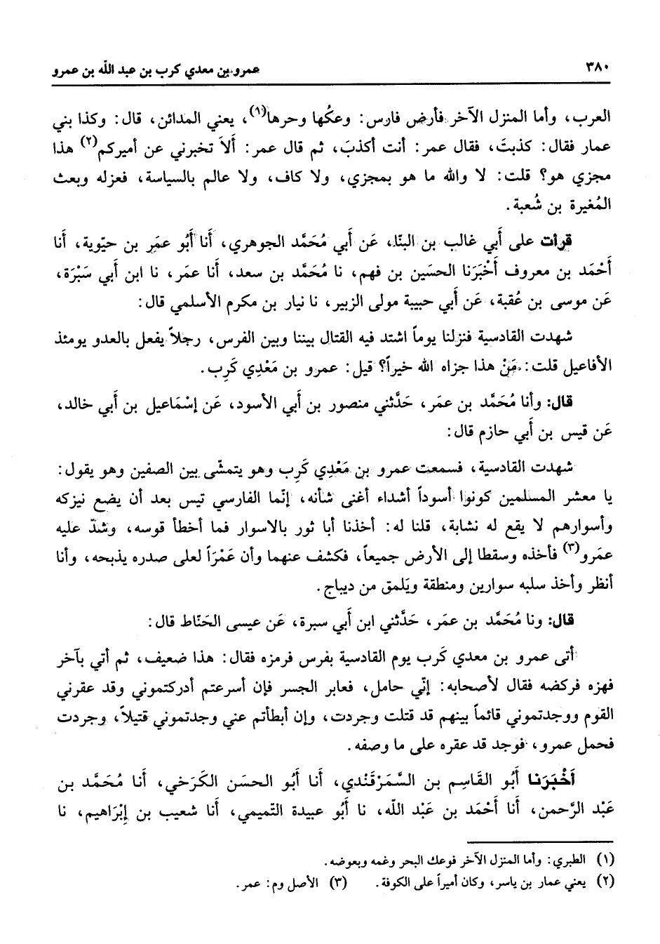 العرب وأما المنزل الآخر فأرض وعكها وحرها (1) يعني المدائن قال وكذا بني عمار فقال كذبت فاقل عمر أنت أكذب ثم قال عمر ألا تخبرني عن أميركم (2) هذا مجزي هو قلت لا والله ما هو بمجزي ولا كاف ولا عالم بالسياسة فعزه وبعث المغيرة بن شعبة قرأت على أبي غالب بن البنا عن أبي محمد الجوهري أنا أبو عمر بن حيوية أنا أحمد بن معروف أخبرنا الحسين بن فهم نا محمد بن سعد أنا عمر نا ابن أبي سبرة عن موسى بن عقبة عن أبي حبيبة مولى الزبير نا نيار بن مكرم الأسلمي قال شهدت القادسية فنزلنا يوما اشتد فيه القتال بيننا وبين الفرس رجلا يفعل بالعدو يومئذ الأفاعيل قلت من هذا جزاه الله خيرا قيل عمرو بن معدي كرب قال وأنا محمد بن عمر حدثني منصور بن أبي الأسود عن إسماعيل بن أبي خالد عن قيس بن أبي حازم قال شهدت القادسية فسمعت عمرو بن معدي كرب وهو يتمشى بين الصفين وهو يقول يا معشر المسلمين كونوا أسودا أشداء أغنى شأنه إنما الفارسي تيس بعد أن يضع نيزكه وأسوارهم لا يقع له نشابة قلنا له أخذنا أبا ثور بالأسوار فما أخطأ قوسه وشد عليه عمرو (3) فأخذه وسقطا إلى الأرض جميعا فكشف عنهما وأن عمرا لعلى صدره يذبحه وأنا أنظر وأخذ سلبه سوارين ومنطقة ويلمق من ديباج قال ونا محمد بن عمر حدثني ابن أبي سبرة عن عيسى الحناط قال أتى عمرو بن معدي كرب يوم القادسية بفرس فرمزه فقال هذا ضعيف ثم أتي بآخر فهزه فركضه فقال لأصحابه إني حامل فعابر الجسر فإن أسرعتم أدركتموني وقد عقرني القوم ووجدتموني قائما بينهم قد قتلت وجردت وإن أبطأتم عني وجدتموني قتيلا وجردت فحمل عمرو فوجد قد عره على ما وصفه أخبرنا أبو القاسم بن السمرقندي أنا أبو الحسن الكرخي أنا محمد بن عبد الرحمن أنا أحمد بن عبد الله نا أبو عبيدة التميمي أنا شعيب بن إبراهيم نا