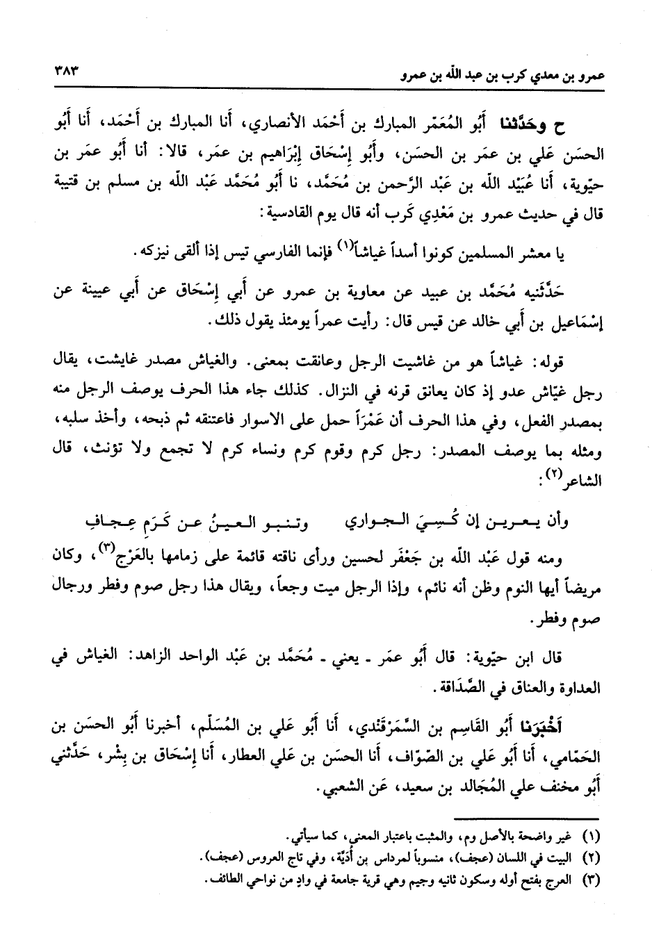 ح وحدثنا أبو المعمر المبارك بن أحمد الأنصاري أنا المبارك بن أحمد أنا أبو الحسن علي بن عمر بن الحسن وأبو إسحاق إبراهيم بن عمر قالا أنا أبو عمر بن حيوية أنا عبيد الله بن عبد الرحمن بن محمد نا أبو محمد عبد الله بن مسلم بن قتيبة قال في حديث عمرو بن معدي كرب أنه قال يوم القادسية يا معشر المسلمين كنوا أسدا غياشا (1) فإنما الفارسي تيس إذا ألقى نيزكه حدثنيه محمد بن عبيد عن معاوية بن عمرو عن أبي إسحاق عن أبي عيينة عن إسماعيل بن أبي خالد عن قيس قال رأيت عمرا يومئذ يقول ذلك قوله غياشا هو من غاشيت الرجل وعانقت بمعنى والغياش مصدر غايشت يقال رجل غياش عدو إذ كان يعانق قرنه في النزال كذلك جاء هذا الحرف يوصف الرجل منه بمصدر الفعل وفي هذه الحرف أن عمرا حمل على الأسوار فاعتنقه ثم ذبحه وأخذ سلبه ومثله بما يوصف المصدر رجل كرم وقوم كرم ونساء كرم لا تجمع ولا تؤنث قال الشاعر (2) * وأن يعربن إن كسي الجواري * وتنبو العين عن كرم عجاف * ومنه قول عبد الله بن جعفر لحسين ورأى ناقته قائمة على زمامها بالعرج (3) وكان مريضا أيها النوم وظن أنه نائم وإذا الرجل ميت وجعا ويقال هذا رجل صوم وفطر ورجال صوم وفطر قال ابن حيوية قال أبو عمر يعني محمد بن عبد الواحد الزاهد الغياش في العداوة والعناق في الصداقة أخبرنا أبو القاسم بن السمرقندي أنا أبو علي بن المسلم أخبرنا أبو الحسن بن الحمامي أنا أبو علي بن الصواف أنا الحسن بن علي العطار أنا إسحاق بن بشر حدثني أبو مخنف علي المجالد بن سعيد عن الشعبي