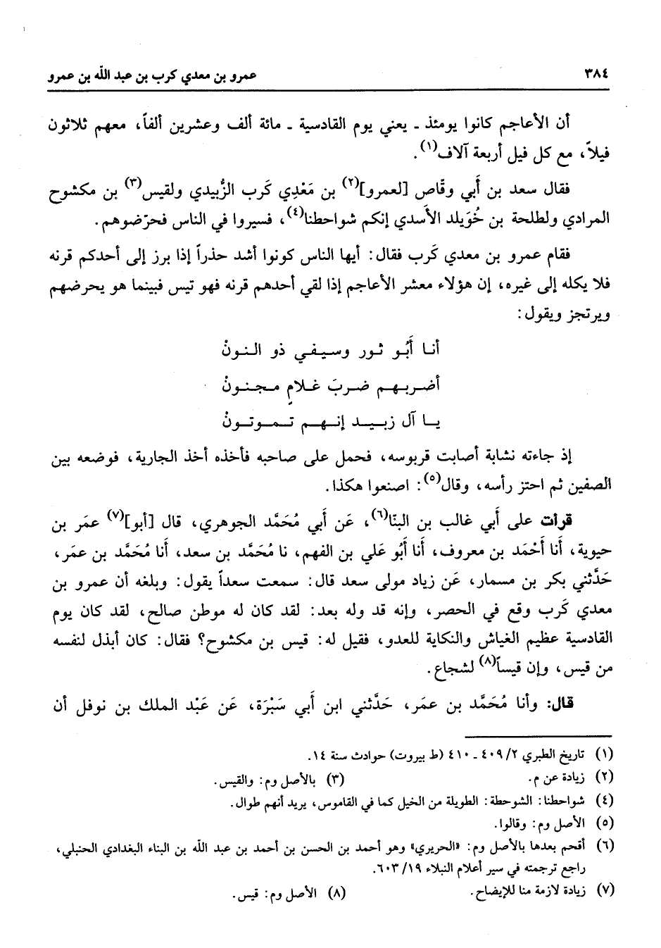 أن الأعاجم كانوا يومئذ يعني يوم القادسية مائة ألف وعشرين ألفا معهم ثلاثون فيلا مع كل فيل أربعة آلاف (1) فقال سعد بن أبي وقاص لعمرو (2) بن معدي كرب الزبيدي ولقيس (3) بن مكشوح المرادي ولطلحة بن خويلد الأسدي إنكم شواحطنا (4) فسيروا في الناس فحرضوهم فقام عمرو بن معدي كرب فقال أيها الناس كونوا أشد حذرا إذا برز إلى أحدكم قرنه فلا يكله إلى غيره إن هؤلاء معشر الأعاجم إذا لقي أحدهم قرنه فهو تيس فبينما هو يحرضهم ويرتجز ويقول * أنا أبو ثور وسيفي ذو النون * أضربهم ضرب غلام مجنون * يا آل زبيد إنهم تموتون إذ جاءته نشابة أصابت قربوسه فحمل على صاحبه فأخذه أخذ الجارية فوضعه بين الصفين ثم احتز رأسه وقال (5) اصنعوا هكذا قرأت على أبي غالب بن البنا (6) عن أبي محمد الجوهري قال أبو (7) عمر بن حيوية أنا أحمد بن معروف أنا أبو علي بن الفهم نا محمد بن سعد أنا محمد بن عمر حدثني بكر بن مسمار عن زياد مولى سعد قال سمعت سعدا يقول وبلغه عن أعمرو بن معدي كرب وقع في الحصر وإنه قد وله بعد لقد كان له موطن صالح لقد كان يوم القادسية عظيم الغياش والنكاية للعدو فقيل له قيس بن مكشوح فقال كان أبذل لنفسه من قيس وإن قيسا (8) لشجاع قال وأنا محمد بن عمر حدثني ابن أبي سبرة عن عبد الملك بن نوفل أن