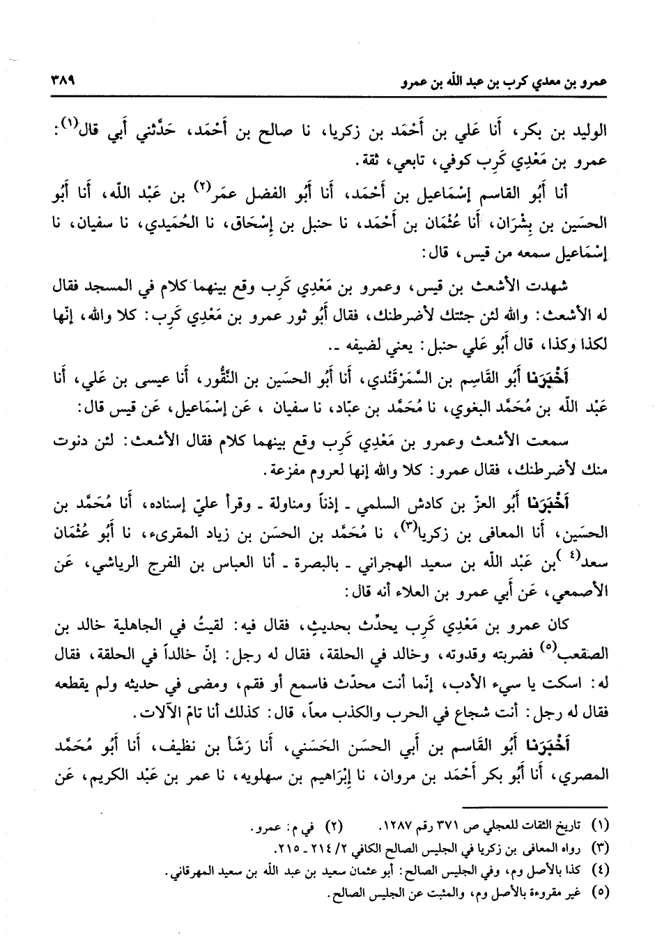 الوليد بن بكر أنا علي بن أحمد بن زكريا نا صالح بن أحمد حدثني أبي قال (1) عمرو بن معدي كرب كوفي تابعي ثقة