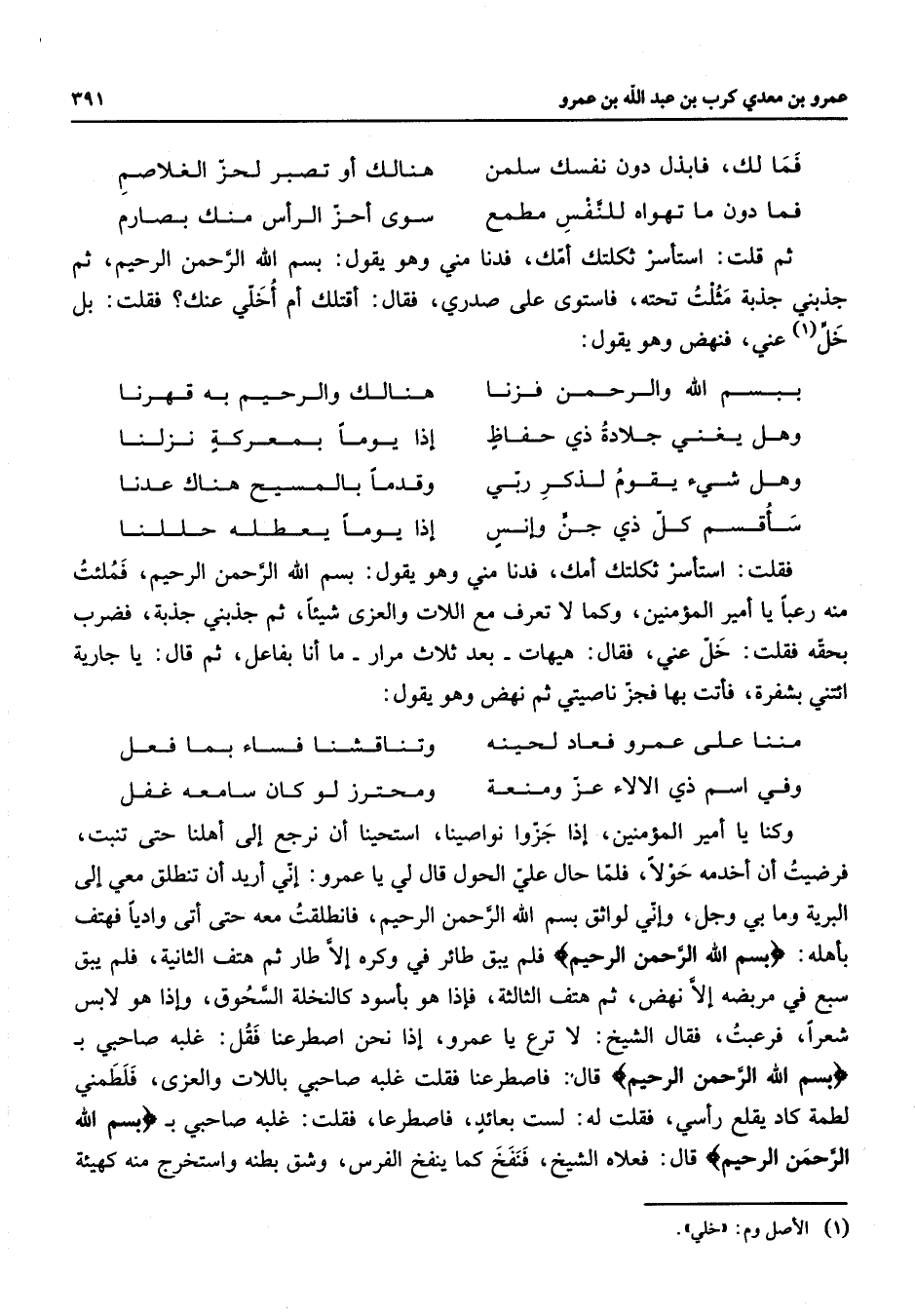 فما لك فابذل دون نفسك سلمن * هنالك أو تصبر لحز الغلاصم فما دون ما تهواه للنفس مطمع * سوى أحز الرأس منك بصارم * ثم قلت استأسر ثكلتك أمك فدنا مني وهو يقول بسم الله الرحمن الرحيم ثم جذبني جذبة مثلت تحته فاستوى عى صدري فقال أقتلك أم أخلي عنك فقلت بل خل (1) عني فنهض وهو يقول * ببسم الله والرحمن فزنا * هنالك والرحيم به قهرنا وهل يغني جلادة ذي حفاظ * إذا يوما بمعركة نزلنا وهل شئ يقوم لذكر ربي * وقدما بالمسيح هناك عدنا سأقسم كل ذي جن وإنس * إذا يوما يعطله حللنا * فقلت استأسر ثكلتك أمك فدنا مني وهو يقول بسم الله الرحمن الرحيم فملئت منه رعبا يا أمير المؤمنين وكما لا تعرف مع اللات والعزى شيئا ثم جذبني جذبة فضرب بحقه فقلت خل عني فقال هيهات بعد ثلاث مرار ما أنا بفاعل ثم قال يا جارية ائتني بشفرة فأتت بها فجز ناصيتي ثم نهض وهو يقول * مننا على عمرو فعاد لحينه * وتناقشنا فساء بما فعل وفي اسم ذي الالاء عز ومنعة * ومحترز لو كان سامه غفل * وكنا يا أمير المؤمنين إذا جزوا نواصينا استحينا أن نرجع إلى أهلنا حتى تنبت فرضيت أن أخدمه حولا فلما حال علي الحول قال لي يا عمرو إني أريد أن تنطلق معي إلى البرية وما بي وجل وإني لواثق بسم الله الرحمن الرحيم فانطلقت معه حتى أتى واديا فهتف بأهله " بسم الله الرحمن الرحيم " فلم يبق طائر في وكره إلا طار ثم هتف الثانية فلم يبق سبع في مربضه إلا نهض ثم هتف الثالثة فإذا هو بأسود كالنخلة السحوق وإذا هو لابس شعرا فرعبت فقال الشيخ لا ترع يا عمرو إذا نحن اصطرعنا فقل غليه صاحبي ب " بسم الله الرحمن الرحيم " قال فاصطرعنا فقلت غلبه صاحبي باللات والعزى فلطمني لطمة كاد يقلع رأسي فقلت له لست بعائد فاصطرعا فقلت غلبه صاحبي ب " بسم الله الرحمن الرحيم " قال فعلاه الشيخ فنفخ كما ينفخ الفرس وشق بطنه واستخرج منه كهيئة