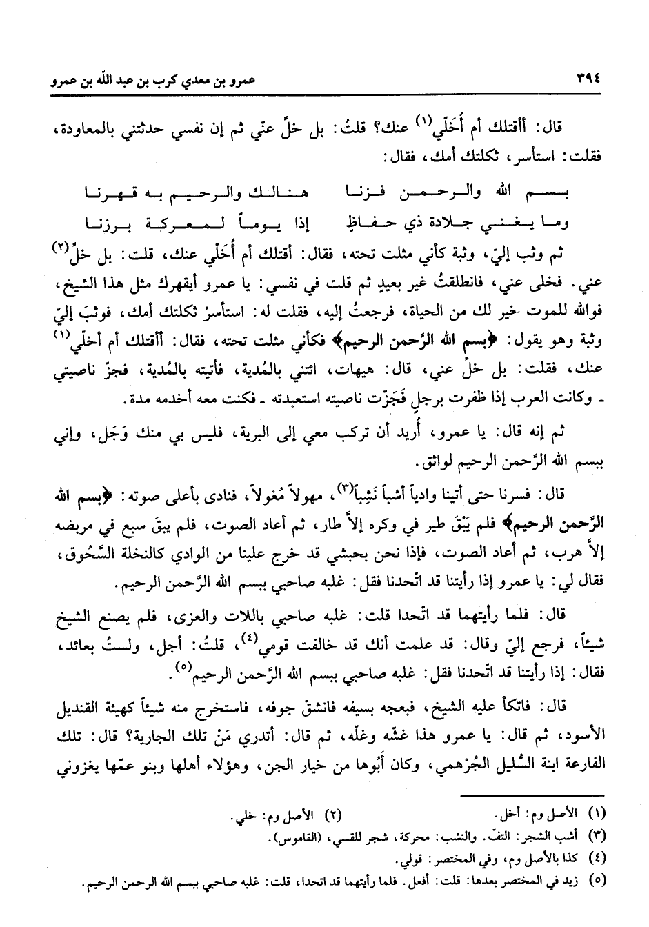 قال أأقتلك أم أخلي (1) عنك قلت بل خل عني ثم إن نفسي حدثتني بالمعاودة فقلت استأسر ثكلتك أمك فقال * بسم الله والرحمن فزنا * هنالك والرحيم به قهرنا وما يغني جلادة ذي حفاظ * إذا يوما لمعركة برزنا * ثم وثب إلي وثبة كأني مثلت تحته فقال أقتلك أم أخلي عنك قلت بل خل عني فخلى (2) عني فانطلقت غير بعيد ثم قلت في نفسي يا عمرو أيقهرك مثل هذا الشيخ فوالله للموت خير لك من الحياة فرجعت إليه فقلت له استأسر ثكلتك أمك فوثب إلي وثبة وهو يقول " بسم الله الرحمن الرحيم " فكأني مثلت تحته فقال أأقتلك أم أخلي (1) عنك فقلت بل خل عني قال هيهات ائتني بالمدية فأتيته بالمدية فجز ناصيتي وكانت العرب إذا ظفرت برجل فجزت ناصيته استعبدته فكنت معه أخدمه مدة ثم إنه قال يا عمرو أريد أن تركب معي إلى البرية فليس بي منك وجل وإني ببسم الله الرحمن الرحيم لواثق قال فسرنا حتى أتينا واديا أشبا نشبا (3) مهولا مغولا فنادى بأعلى صوته " بسم الله الرحمن الرحيم " فلم يبق طير في وكره إلا طار ثم أعاد الصوت فلم يبق سبع في مربضه إلا هرب ثم أعاد الصوت فإذا نحن بحبشي قد خرج علينا من الوادي كالنخلة السحوق فقال لي يا عمرو إذا رأيتنا قد اتحدنا فقل غلبه صاحبي ببسم الله الرحمن الرحيم قال فلما رأيتهما قد اتحدا قلت غلبه صاحبي باللات والعزى فلم يصنع الشيخ شيئا فرجع إلي وقال قد علمت أنك قد خالفت قومي (4) قلت أجل ولست بعائد فقال إذا رأيتنا قد اتحدنا فقل غلبه صاحبي ببسم الله الرحمن الرحيم (5) قال فاتكأ عليه الشيخ فبعجه بسيفه فانشق جوفه فاستخرج منه شيئا كهيئة القنديل الأسود ثم قال يا عمرو هذا غشه وغله ثم قال أتدري من تلك الجارية قال تلك الفارعة ابن السليل الجرهمي وكان أبوها من خيار الجن وهؤلاء أهلها وبنو عمها يغزوني