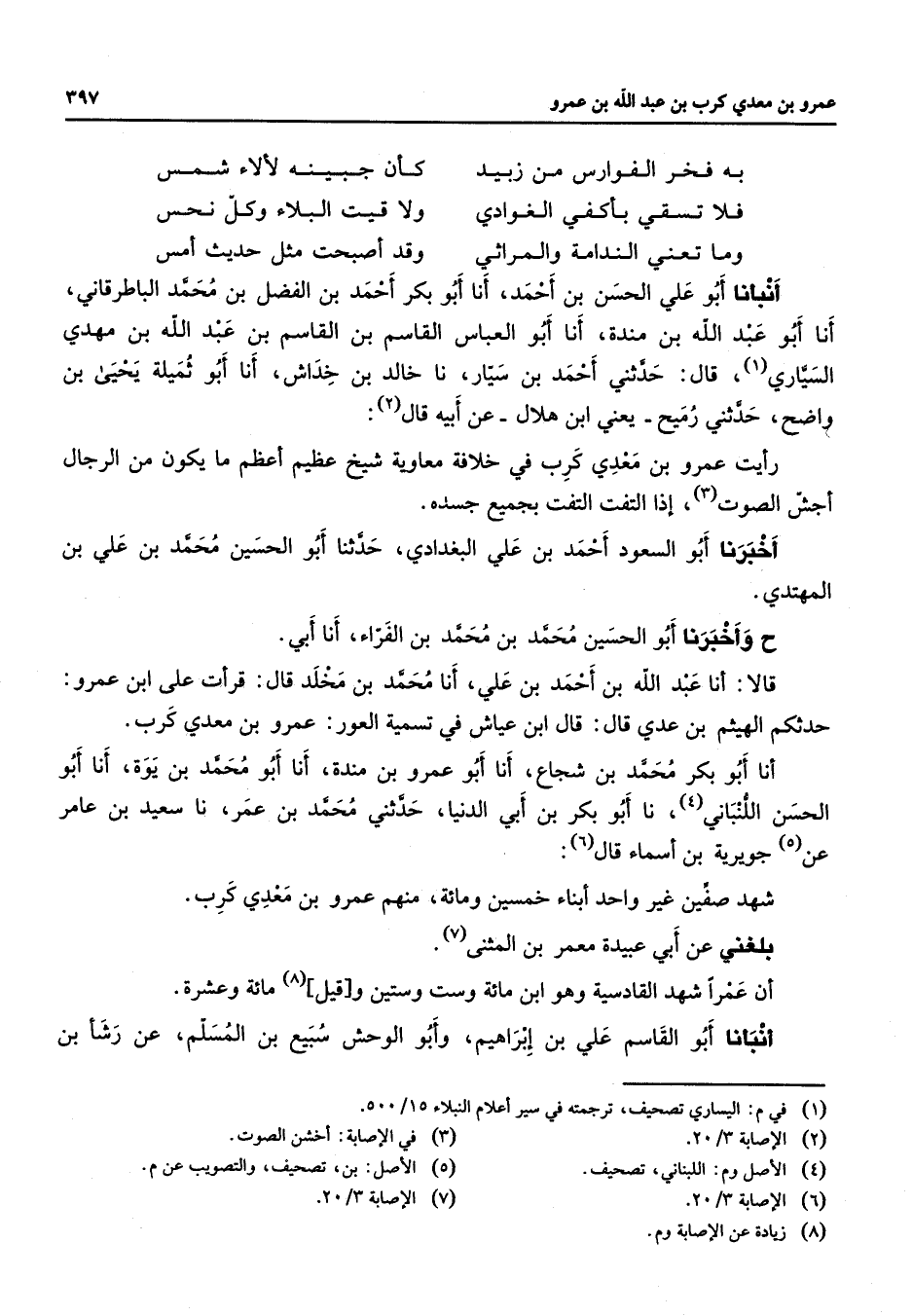 به فخر الفوارس من زبيد * كأن جبينه لألاء شمس فلا تسقي بأكفي الغوادي * ولا قيت البلاء وكل نحس وما تعني الندامة والمراثي * وقد أصبحت مثل حديث أمس * أنبأنا أبو علي الحسن بن أحمد أنا أبو بكر أحمد بن الفضل بن محمد الباطرقاني أنا أبو عبد الله بن مندة أنا أبو العباس القاسم بن القاسم بن عبد الله بن مهدي السياري (2) قال حدثني أحمد بن سيار نا خالد بن خداش أنا أبو ثميلة يحيى بن واضح حدثني رميح يعني ابن هلال عن أبيه قال (2) رأيت عمرو بن معدي كرب في خلافة معاوية شيخ عظيم أعظم ما يكون من الرجال أجش الصوت (3) إذا التفت التفت بجميع جسده أخبرنا أبو السعود أحمد بن علي البغدادي حدثنا أبو الحسين محمد بن علي بن المهتدي ح وأخبرنا أبو الحسين محمد بن محمد بن الفراء أنا أبي قالا أنا عبد الله بن أحمد بن علي أنا محمد بن مخلد قال قرأت على ابن عمرو حدثكم الهيثم بن عدي قال قال ابن عياش في تسمية العور عمرو بن معدي كرب أنا أبو بكر محمد بن شجاع أنا أبو عمرو بن مندة أنا أبو محمد بن يوة أنا أبو الحسن اللنباني (4) نا أبو بكر بن أبي الدنيا حدثني محمد بن عمر نا سعيد بن عامر عن (5) جويرة بن أسماء قال (6) شهد صفين غير واحد أبناء خمسين ومائة منهم عمرو بن معدي كرب بلغني عن أبي عبيدة معمر بن المثنى (7) أن عمرا شهد القادسية وهو ابن مائة وست وستين وقيل مائة وعشرة (8) أنبأنا أبو القاسم علي بن إبراهيم وأبو الوحش سبيع بن المسلم عن رشأ بن