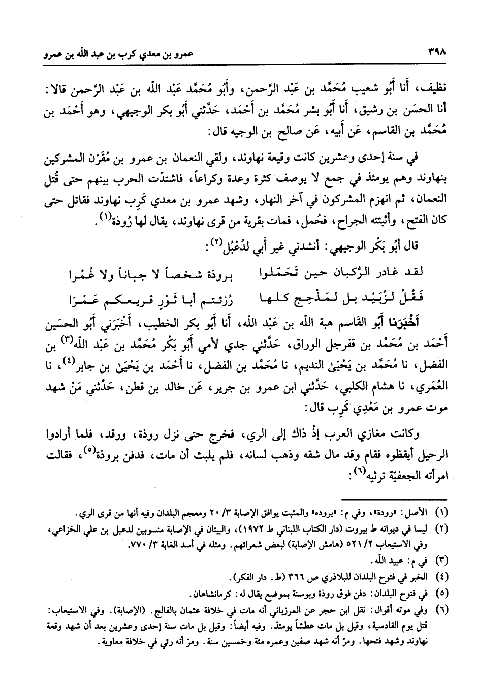 نظيف أنا أبو شعيب محمد بن عبد الرحمن وأبو محمد عبد الله بن عبد الرحمن قالا أنا الحسن بن رشيق أنا أبو بشر محمد بن أحمد حدثني أبو بكر الوجيهي وهو أحمد بن محمد بن القاسم عن أبيه عن صالح بن الوجيه قال في سنة إحدى وعشرين كانت وقيعة نهاوند ولقي النعمان بن عمرو بن مقرن المشركين بنهاوند وهم يومئذ في جمع لا يوصف كثرة وعدة وكراعا فاشتدت الحرب بينهم حتى قتل النعمان ثم انهزم المشركون في آخر النهار وشهد عمرو بن معدي كرب نهاوند فقاتل حتى كان الفتح وأثبتته الجارح فحمل فمات بقرية من قرى نهاوند يقال لها روذة (1) قال أبو بكر الوجيهي أنشدني غير أبي لدعبل (2) * لقد غادر الركبان حين تحملوا * بروذة شخصا لا جبانا ولا غمرا فقل لزبيد بل لمذحج كلها * رزئتم أبا ثور قريعكم عمرا * أخبرنا أبو القاسم هبة الله بن عبد الله أنا أبو بكر الخطيب أخبرني أبو الحسين أحمد بن محمد بن قفرجل الوراق حدثني جدي لأمي أبو بكر محمد بن عبد الله (3) بن الفضل نا محمد بن يحيى النديم نا محمد بن الفضل نا أحمد بن يحيى بن جابر (4) نا العمري نا هشام الكلبي حدثني ابن عمرو بن جرير عن خالد بن قطن حدثني من شهد موت عمرو بن معدي كرب قال وكانت مغازي العرب إذ ذاك إلى الري فخرج حتى نزل روذة ورقد فلما أرادوا الرحيل أيقظوه فقام وقد مال شقه وذهب لسانه فلم يلبث أن مات فدفن بروذة فقالت امرأته الجعفية ترثيه (6)