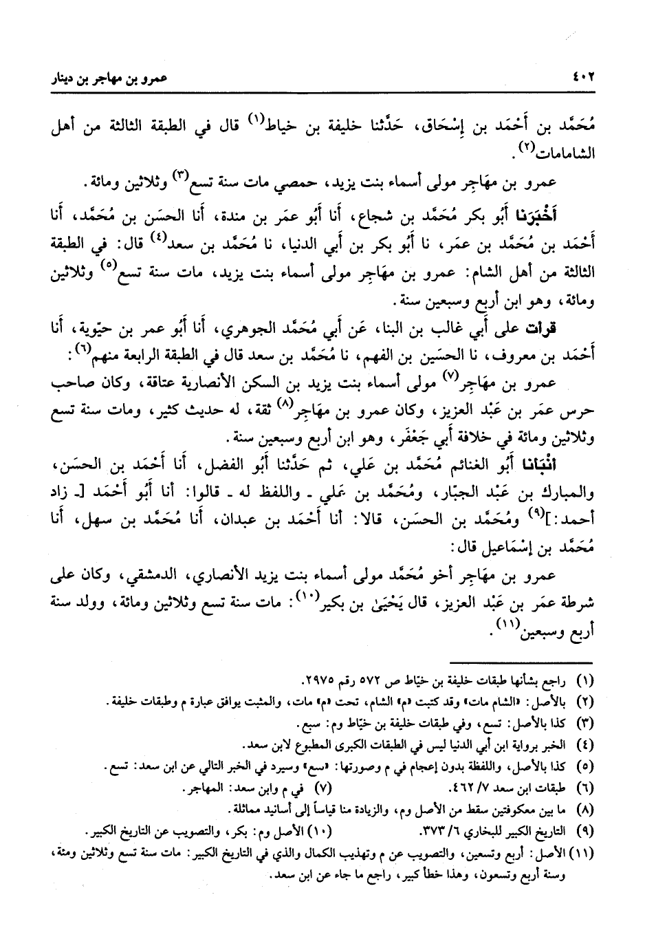 محمد بن أحمد بن إسحاق حدثنا خليفة بن خياط (1) قال في الطبقة الثالثة من أهل الشامامات (2) عمرو بن مهاجر مولى أسماء بنت يزيد حمصي مات سنة تسع (3) وثلاثين ومائة أخبرنا أبو بكر محمد بن شجاع أنا أبو عمر بن مندة أنا الحسن بن محمد أنا أحمد بن محمد بن عمر نا أبو بكر بن أبي الدنيا نا محمد بن سعد (4) قال في الطبقة الثالثة من أهل الشام عمرو بن مهاجر مولى أسماء بنت يزيد مات سنة تسع (5) وثلاثين ومائة وهو ابن أربع وسبعين سنة قرأت على أبي غالب بن البنا عن أبي محمد الجوهري أنا أبو عمر بن حيوية أنا أحمد بن معروف نا الحسين بن الفهم نا محمد بن سعد قال في الطبقة الرابعة منهم (6) عمرو بن مهاجر (7) مولى أسماء بنت يزيد بن السكن الأنصارية عتاقة وكان صاحب حرس عمر بن عبد العزيز وكان عمرو بن مهاجر (8) ثقة له حديث كثير ومات سنة تسع وثلاثين ومائة في خلافة أبي جعفر وهو ابن أربع وسبعين سنة أنبأنا أبو الغنائم محمد بن علي ثم حدثنا أبو الفضل أنا أحمد بن الحسن والمبارك بن عبد الجبار ومحمد بن علي واللفظ له قالوا أنا أبو أحمد زاد أحمد (9) ومحمد بن الحسن قالا أنا أحمد بن عبدان أنا محمد بن سهل أنا محمد بن إسماعيل قال عمرو بن مهاجر أخو محمد مولى أسماء بنت يزيد الأنصاري الدمشقي وكان على شرطة عمر بن عبد العزيز قال يحيى بن بكير (10) مات سنة تسع وثلاثين ومائة وولد سنة أربع وسبعين (11)