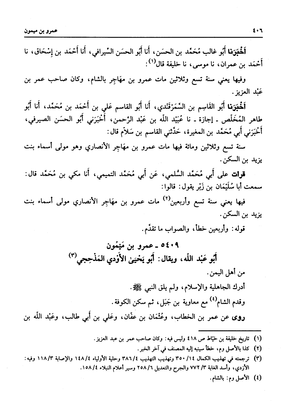 أخبرنا أبو غالب محمد بن الحسن أنا أبو الحسن السيرافي أنا أحمد بن إسحاق نا أحمد بن عمران نا موسى نا خليفة قال (1) وفيها يعني سنة تسع وثلاثين مات عمرو بن مهاجر بالشام وكان صاحب عمر بن عبد العزيز أخبرنا أبو القاسم بن السمرقندي أنا أبو القاسم علي بن أحمد بن محمد أنا أبو طاهر المخلص إجازة نا عبيد الله بن عبد الرحمن أخبرني أبو الحسن الصيرفي أخبرني أبي محمد بن المغيرة حدثني القاسم بن سلام قال سنة تسع وثلاثين ومائة فيها مات عمرو بن مهاجر الأنصاري وهو مولى أسماء بنت يزيد بن السكن قرأت على أبي محمد السلمي عن أبي محمد التميمي أنا مكي بن محمد قال سمعت أبا سليمان بن زبر يقول قالوا فيها يعني سنة تسع وأربعين (2) مات عمرو بن مهاجر الأنصاري مولى أسماء بنت يزيد بن السكن قوله وأربعين خطأ والصواب ما تقدم