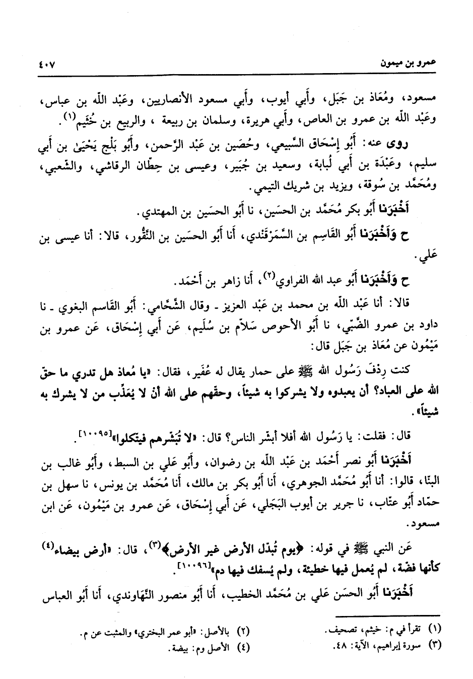 مسعود ومعاذ بن جبل وأبي أيوب وأبي مسعود الأنصاريين وعبد الله بن عباس وعبد الله بن عمرو بن العاص وأبي هريرة وسلمان بن ربيعة والربيع بن خثيم (1) روى عنه أبو إسحاق السبيعي وحصين بن عبد الرحمن وأبو بلج يحيى بن أبي سليم وعبدة بن أبي لبابة وسعيد بن جبير وعيسى بن حطان الرقاشي والشعبي ومحمد بن سوقة ويزيد بن شريك التيمي أخبرنا أبو بكر محمد بن الحسين نا أبو الحسين بن المهتدي ح وأخبرنا أبو القاسم بن السمرقندي أنا أبو الحسين بن النقور قالا أنا عيسى بن علي ح وأخبرنا أبو عبد الله الفراوي (2) أنا زاهر بن أحمد قالا أنا عبد الله بن محمد بن عبد العزيز وقال الشحامي أبو القاسم البغوي نا داود بن عمرو الضبي نا أبو الأحوص سلام بن سليم عن أبي إسحاق عن عمرو بن ميمون عن معاذ بن جبل قال كنت ردف رسول الله (صلى الله عليه وسلم) على حمار يقال له عفير فقال يا معاذ هل تدري ما حق الله على العباد أن يعبدوه ولا يشركوا به شيئا وحقهم على الله أن لا يعذب من لا يشرك به شيئا قال فقلت يا رسول الله أفلا أبشر الناس قال لا تبشرهم فيتكلوا