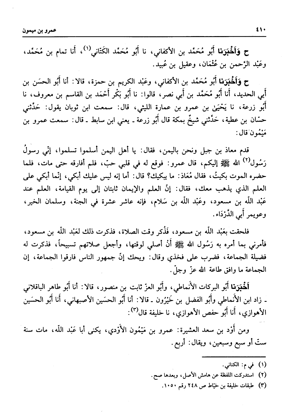 ح وأخبرنا أبو محمد بن الأكفاني نا أبو محمد الكتاني (1) أنا تمام بن محمد وعبد الرحمن بن عثمان وعقيل بن عبيد ح وأخبرنا أبو محمد بن الأكفاني وعبد الكريم بن حمزة قالا أنا أبو الحسن بن أبي الحديد أنا أبو محمد بن أبي نصر قالوا نا أبو بكر أحمد بن القاسم بن معروف نا أبو زرعة نا يحيى بن عمرو بن عمارة الليثي قال سمعت ابن ثوبان يقول حدثني حسان بن عطية حدثني شيخ بمكة قال أبو زرعة يعني ابن سابط قال سمعت عمرو بن ميمون قال قدم معاذ بن جبل ونحن باليمن فقال يا أهل اليمن أسلموا تسلموا إني رسول رسول (2) الله (صلى الله عليه وسلم) إليكم قال عمرو فوقع له في قلبي حب فلم أفارقه حتى مات فلما حضره الموت بكيت فقال معاذ ما يبكيك قال أما إنه ليس عليك أبكي إنما أبكي على العلم الذي يذهب معك فقال إن العلم والإيمان ثابتان إلى يوم القيامة العلم عند عبد الله بن مسعود وعبد الله بن سلام فإنه عاشر عشرة في الجنة وسلمان الخير وعويمر أبي الدرداء فلحقت بعبد الله بن مسعود فذكر وقت الصلاة فذكرت ذلك لعبد الله بن مسعود فأمرني بما أمره به رسول الله (صلى الله عليه وسلم) أن أصلي لوقتها وأجعل صلاتهم تسبيحا فذكرت له فضيلة الجماعة فضربعلى فخذي وقال ويحك إن جمهور الناس فارقوا الجماعة إن الجماعة ما وافق طاعة الله عز وجل أخبرنا أبو البركات الأنماطي وأبو العز ثابت بن منصور قالا أنا أبو طاهر الباقلاني زاد ابن الأنماطي وأبو الفضل بن خيرون قالا أنا أبو الحسين الأصبهاني أنا أبو الحسين الأهوازي أنا أبو حفص الأهوازي نا خليفة قال (3) ومن أود بن سعد العشيرة عمرو بن ميمون الأودي يكنى أبا عبد الله مات سنة ست أو سبع وسبعن ويقال أربع
