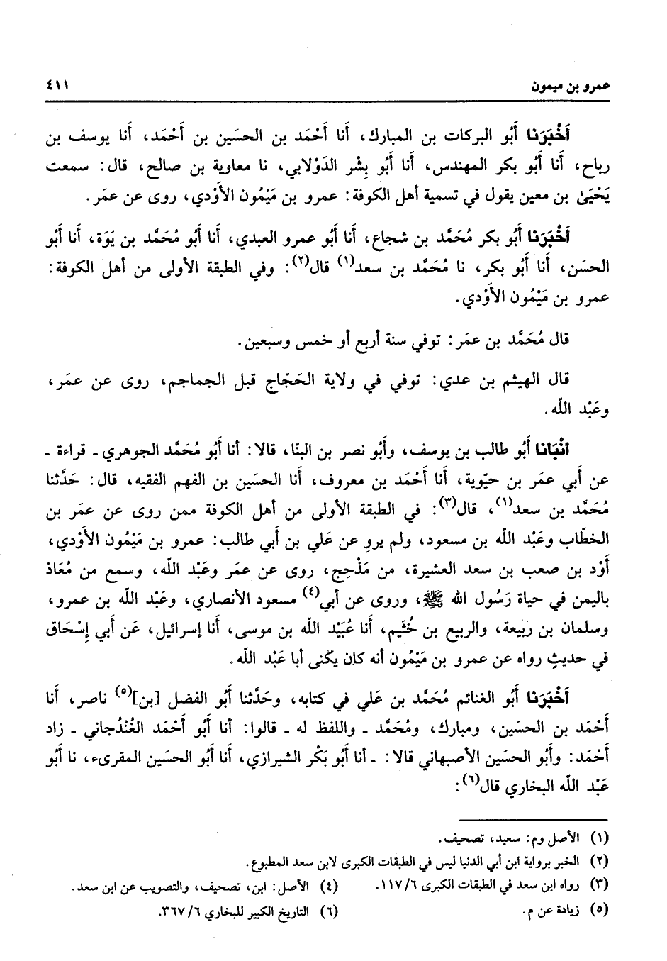 أخبرنا أبو البركات بن المبارك أنا أحمد بن الحسين بن أحمد أنا يوسف بن رباح أنا أبو بكر المهندس أنا أبو بشر الدولابي نا معاوية بن صالح قال سمعت يحيى بن معين يقول في تسمية أهل الكوفة عمرو بن ميمون الأودي روى عن عمر أخبرنا أبو بكر محمد بن شجاع أنا أبو عمرو العبدي أنا أبو محمد بن يوة أنا أبو الحسن أنا أبو بكر نا محمد بن سعد (1) قال (2) وفي الطبقة الأولى من أهل الكوفة عمرو بن ميمون الأودي قال محمد بن عمر توفي سنة أربع أو خمس وسبعين قال الهيثم بن عدي توفي في ولاية الحجاج قبل الجماجم روى عن عمر وعبد الله أنبأنا أبو طالب بن يوسف وأبو نصر بن البنا قالا أنا أبو محمد الجوهري قراءة عن أبي عمر بن حيوية أنا أحمد بن معروف أنا الحسين بن الفهم الفقيه قال حدثنا محمد بن سعد (1) قال (3) في الطبقة الأولى من أهل الكوفة ممن روى عن عمر بن الخطاب وعبد الله بن مسعود ولم يرو عن علي بن أبي طالب عمرو بن ميمون الأودي أود بن صعب بن سعد العشيرة من مذحج روى عن عمر وعبد الله وسمع من معاذ باليمن في حياة رسول الله (صلى الله عليه وسلم) وروى عن أبي (4) مسعود الأنصاري وعبد الله بن عمرو بن وسلمان بن ربيعة والربيع بن خثيم أنا عبيد الله بن موسى أنا إسرائيل عن أبي إسحاق في حديث رواه عن عمرو بن ميمون أنه كان يكنى أبا عبد الله أخبرنا أبو الغنائم محمد بن علي في كتابه وحدثنا أبو الفضل بن (5) ناصر أنا أحمد بن الحسين ومبارك ومحمد واللفظ له قالوا أنا أبو أحمد الغندجاني زاد أحمد وأبو الحسين الأصبهاني قالا أنا أبو بكر الشيرازي أنا أبو الحسين المقرئ نا أبو عبد الله البخاري قال (6)