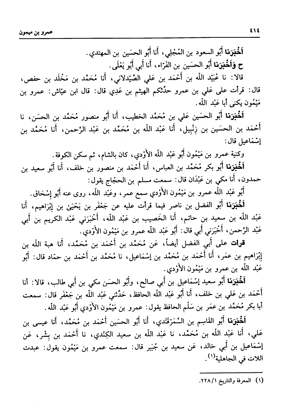 أخبرنا أبو السعود بن المجلي أنا أبو الحسين بن المهتدي ح وأخبرنا أبو الحسين بن الفراء أنا أبي أبو يعلى قالا نا عبيد الله بن أحمد بن علي الصيدلاني أنا محمد بن مخلد بن حفص قال قرأت على علي بن عمرو حدثكم الهيثم بن عدي قال قال ابن عياش عمرو بن ميمون يكنى أبا عبد الله أخبرنا أبو الحسين علي بن محمد الخطيب أنا أبو منصور محمد بن الحسن نا أحمد بن الحسين بن زنبيل أنا عبد الله بن محمد بن عبد الرحمن أنا محمد بن إسماعيل قال وكنية عمرو بن ميمون أبو عبد الله الأودي كان بالشام ثم سكن الكوفة أخبرنا أبو بكر محمد بن العباس أنا أحمد بن منصور بن خلف أنا أبو سعيد بن حمدون أنا مكي بن عبدان قال سمعت مسلم بن الحجاج يقول أبو عبد الله عمرو بن ميمون الأودي سمع عمر وعبد الله روى عنه أبو إسحاق أخبرنا أبو الفضل بن ناصر فيما قرأت عليه عن جعفر بن يحيى بن إبراهيم أنا عبد الله بن سعيد بن حاتم أنا الخصيب بن عبد الله أخبرني عبد الكريم بن أبي عبد الرحمن أخبرني أبي قال أبو عبد الله عمرو بن ميمون الأودي قرأت على أبي الفضل أيضا عن محمد بن أحمد بن محمد أنا هبة الله بن إبراهيم بن عمر أنا أحمد بن محمد بن إسماعيل نا محمد بن أحمد بن حماد قال أبو عبد الله بن عمرو بن ميمون الأودي أخبرنا أبو سعيد إسماعيل بن أبي صالح وأبو الحسن مكي بن أبي طالب قالا أنا أحمد بن علي بن خلف أنا أبو عبد الله الحافظ حدثني عبد الله بن جعفر قال سمعت أبا بكر محمد بن عمر بن سلم الحافظ يقول عمرو بن ميمون الأودي أبو عبد الله أخبرنا أبو القاسم بن السمرقندي أنا أبو الحسين أحمد بن محمد أنا عيسى بن علي أنا عبد الله بن محمد نا عبد الله بن سعيد الكندي نا أحمد بن بشر عن إسماعيل بن أبي خالد عن سعيد بن جبير قال سمعت عمرو بن ميمون يقول عبدت اللات في الجاهلية (1)