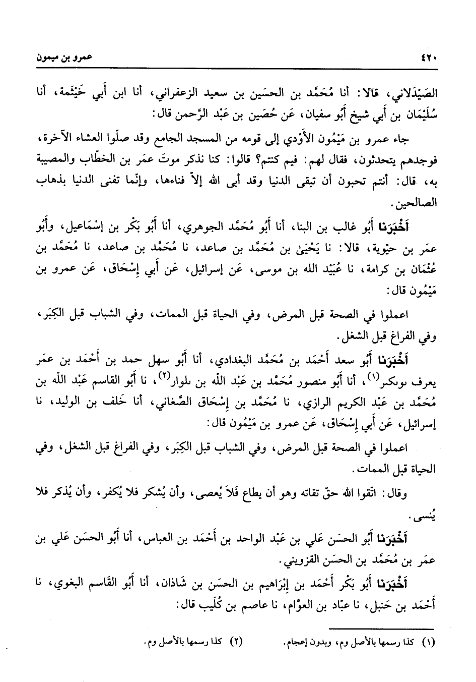 الصيدلاني قالا أنا محمد بن الحسين بن سعيد الزعفراني أنا ابن أبي خيثمة أنا سليمان بن أبي شيخ أبو سفيان عن حصين بن عبد الرحمن قال جاء عمرو بن ميمون الأودي إلى قومه من المسجد الجامع وقد صلوا العشاء الآخرة فوجدهم يتحدثون فقال لهم فيم كنتم قالوا كنا نذكر موت عمر بن الخطاب والمصيبة به قال أنتم تحبون أن تبقى الدنيا وقد أبى الله إلا فناءها وإنما تفنى الدنيا بذهب الصالحين أخبرنا أبو غالب بن البنا أنا أبو محمد الجوهري أنا أبو بكر بن إسماعيل وأبو عمر بن حيوية قالا نا يحيى بن محمد بن صاعد نا محمد بن صاعد نا محمد بن عثمان بن كرامة نا عبيد الله بن موسى عن إسرائيل عن أبي إسحاق عن عمرو بن ميمون قال اعملوا في الصحة قبل المرض وفي الحياة قبل الممات وفي الشباب قبل الكبر وفي الفراغ قبل الشغل أخبرنا أبو سعد أحمد بن محمد البغدادي أنا أبو سهل حمد بن أحمد بن عمر يعرف - و - كبر (1) أنا أبو منصور محمد بن عبد الله بن بلوار (2) نا أبو القاسم عبد الله بن محمد بن عبد الكريم الرازي نا محمد بن إسحاق الصغاني أنا خلف بن الوليد نا إسرائيل عن أبي إسحاق عن عمرو بن ميمون قال اعملوا في الصحة قبل المرض وفي الشباب قبل الكبر وفي الفراغ قبل الشغل وفي الحياة قبل الممات وقال اتقوا الله حق تقاته وهو أن يطاع فلا يعصى وأن يشكر فلا يكفر وأن يذكر فلا ينسى أخبرنا أبو الحسن علي بن عبد الواحد بن أحمد بن العباس أنا أبو الحسن علي بن عمر بن محمد بن الحسن القزويني أخبرنا أبو بكر أحمد بن إبراهيم بن الحسن بن شاذان أنا أبو القاسم البغوي نا أحمد بن حنبل نا عباد بن العوام نا عاصم بن كليب قال
