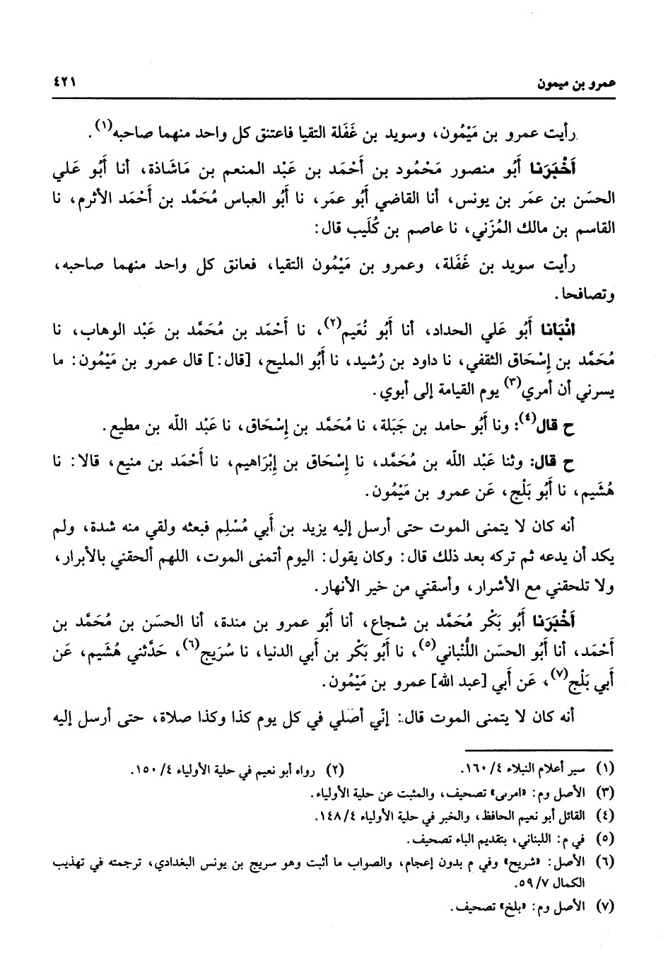 رأيت عمرو بن ميمون وسويد بن غفلة التقيا فاعتنق كل واحد منهما صاحبه (1) أخبرنا أبو منصور محمود بن أحمد بن عبد المنعم بن ماشاذة أنا أبو علي الحسن بن عمر بن يونس أنا القاضي أبو عمر نا أبو العباس محمد بن أحمد الأثرم نا القاسم بن مالك المزني نا عاصم بن كليب قال رأيت سويد بن غفلة وعمرو بن ميمون التقيا فعانق كل واحد منهما صاحبه وتصافحا أنبأنا أبو علي الحداد أنا أبو نعيم (2) نا أحمد بن محمد بن عبد الوهاب نا محمد بن إسحاق الثقفي نا داود بن رشيد نا أبو المليح قال قال عمرو بن ميمون ما يسرني أن أمري (3) يوم القيامة إلى أبوي ح قال (4) ونا أبو حامد بن جبلة نا محمد بن إسحاق نا عبد الله بن مطيع ح قال وثنا عبد الله بن محمد نا إسحاق بن إبراهيم نا أحمد بن منيع قالا نا هشيم نا أبو بلج عن عمرو بن ميمون أنه كان لا يتمنى الموت حتى أرسل إليه يزيد بن أبي مسلم فبعثه ولقي منه شدة ولم يكد أن يدعه ثم تركه بعد ذلك قال وكان يقول اليوم أتمنى الموت اللهم ألحقني بالأبرار ولا تلحقني مع الأشرار وأسقني من خير الأنهار أخبرنا أبو بكر محمد بن شجاع أنا أبو عمرو بن مندة أنا الحسن بن محمد بن أحمد أنا أبو الحسن اللنباني (5) نا أبو بكر بن أبي الدنيا نا سريج (6) حدثني هشيم عن أبي بلج (7) عن أبي عبد الله عمرو بن ميمون أنه كان لا يتمنى الموت قال إني أصلي في كل يوم كذا وكذا صلاة حتى أرسل إليه