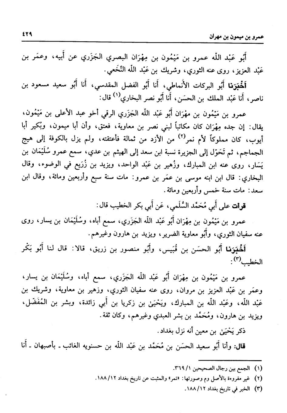 أبو عبد الله عمرو بن ميمون بن مهران البصري الجزري عن أبيه وعمر بن عبد العزيز روى عنه الثوري وشريك بن عبد الله النخعي أخبرنا أبو البركات الأنماطي أنا أبو الفضل المقدسي أنا أبو سعيد مسعود بن ناصر أنا عبد الملك بن الحسن أنا أبو نصر البخاري (1) قال عمرو بن ميمون بن مهران أبو عبد الله الجزري الرقي أخو عبد الأعلى بن ميمون يقال إن جده مهران كان مكاتبا لبني نصر بن معاوية فعتق وأن أبا ميمون وبكير أبا أيوب كان مملوكا لأم نمر (2) من الأزد من ثمالة فأعتقته ولم يزل بالكوفة إلى هيج الجماجم ثم تحول إلى الجزيرة نسبة ابن سعد إلى الهيثم بن عدي سمع عمرو سليمان بن يسار روى عنه ابن المبارك وزهير بن عبد الواحد ويزيد بن زريع في الوضوء وقال البخاري قال ابن ابنه موسى بن عمر بن عمرو مات سنة سبع وأربعين ومائة وقال ابن سعد مات سنة خمس وأربعين ومائة قرأت على أبي محمد السلمي عن أبي بكر الخطيب قال عمرو بن ميمون بن مهران أبو عبد الله الجزري سمع أباه وسليمان بن يسار روى عنه سفيان الثوري وأبو معاوية الضرير ويزيد بن هارون وغيرهم أخبرنا أبو الحسن بن قبيس وأبو منصور بن زريق قالا قال لنا أبو بكر الخطيب (3) عمرو بن ميمون بن مهران أبو عبد الله الجزري سمع أباه وسليمان بن يسار وعمر بن عبد العزيز بن مروان روى عنه سفيان الثوري وزهير بن معاوية وشريك بن عبد الله وعبد الله بن المبارك ويحيى بن زكريا بن أبي زائدة وبشر بن المفضل ويزيد بن هارون ومحمد بن بشر العبدي وغيرهم وكان ثقة ذكر يحيى بن معين أنه نزل بغداد قال وأنا أبو سعيد الحسن بن محمد بن عبد الله بن حسنويه الغائب بأصبهان أنا