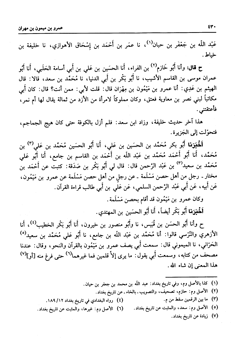 عبد الله بن عفر بن حبان (1) نا عمر بن أحمد بن إسحاق الأهوازي نا خليفة بن خياط ح قال وأنا أبو خازم (2) بن الفراء أنا الحسين بن علي بن أبي أسامة الحلبي أنا أبو عمران موسى بن القاسم الأشيب نا أبو بكر بن أبي الدنيا نا محمد بن سعد قالا قال الهيثم بن عدي أنا عمرو بن ميمون بن مهران قال قلت لأبي ممن أنت قال كان أبي مكاتبا لبني نصر بن معاوية فعتق وكان مملوكا لامرأة من الأزد من ثمالة يقال لها أم نمر فأعتقتني هذا آخر حديث خليفة وزاد ابن سعد فلم أزل بالكوفة حتى كان هيج الجماجم فتحولت إلى الجزيرة أخبرنا أبو بكر محمد بن الحسين بن علي أنا أبو الحسين محمد بن علي (3) بن محمد أنا أبو أحمد محمد بن عبد الله بن أحمد بن القاسم بن جامع أنا أبو علي محمد بن سعيد (3) بن عبد الرحمن قال قال لي أبو بكر بن صدقة كتبت عن أحمد بن مختار رجل من أهل حصن مسلمة عن رجل من أهل حصن مسلمة عن عمرو بن ميمون عن أبيه عن أبي عبد الرحمن السلمي عن علي بن أبي طالب قراءة القرآن وكان عمرو بن ميمون قد أقام بحصن مسلمة أخبرنا أبو بكر أيضا أنا أبو الحسين بن المهتدي ح وأنا أبو الحسن بن قبيس نا وأبو منصور بن خيرون أنا أبو بكر الخطيب (4) أنا الأزهري والنرسي قالوا أنا محمد بن عبد الله بن جامع نا أبو علي محمد بن سعيد (5) الحراني نا الميموني قال سمعت أبي يصف عمرو بن ميمون بالقرآن والنحو وقال عندنا مصحف من كتابه وسمعت أبي يقول ما يرى إلا قلمين فما غيرهما (6) حتى فرغ منه أو (7) هذا المعنى إن شاء الله