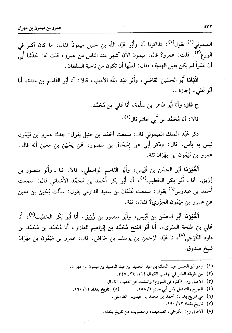 الميموني (1) يقول (2) تذاكرنا أنا وأبو عبد الله بن حنبل ميمونا فقال ما كان أكبر في الورع (3) قلت عمرو قال ميمون الآن أشهر عند الناس من عمرو قلت له حدثنا أبي أن عمرا لم يكن يقبل الهدية فقال لعلها أن تكون من ناحية السلطان أنبأنا أبو الحسين القاضي وأبو عبد الله الأديب قالا أنا أبو القاسم بن مندة أنا أبو علي إجازة ح قال وأنا أبو طاهر بن سلمة أنا علي بن محمد قالا أنا محمد بن أبي حاتم قال (4) ذكر عبد الملك الميموني قال سمعت أحمد بن حنبل يقول جدك عمرو بن ميمون ليس به بأس قال وذكر أبي عن إسحاق بن منصور عن يحيى بن معين أنه قال عمرو بن ميمون بن مهران ثقة أخبرنا أبو الحسن بن قبيس وأبو القاسم الواسطي قالا ثنا وأبو منصور بن زريق أنا أبو بكر الخطيب (5) أنا أبو بكر أحمد بن محمد الأشناني قال سمعت أحمد بن عبدوس (6) يقول سمعت عثمان بن سعيد الدارمي يقول سألت يحيى بن معين عن عمرو بن ميمون الجزري فقال ثقة أخبرنا أبو الحسن بن قبيس وأبو منصور بن زريق أنا أبو بكر الخطيب (7) أنا علي بن طلحة المقرئ أنا أبو الفتح محمد بن إبراهيم الغازي أنا محمد بن محمد بن داود الكرجي (8) نا عبد الرحمن بن يوسف بن خراش قال عمرو بن ميمون بن مهران شيخ صدوق