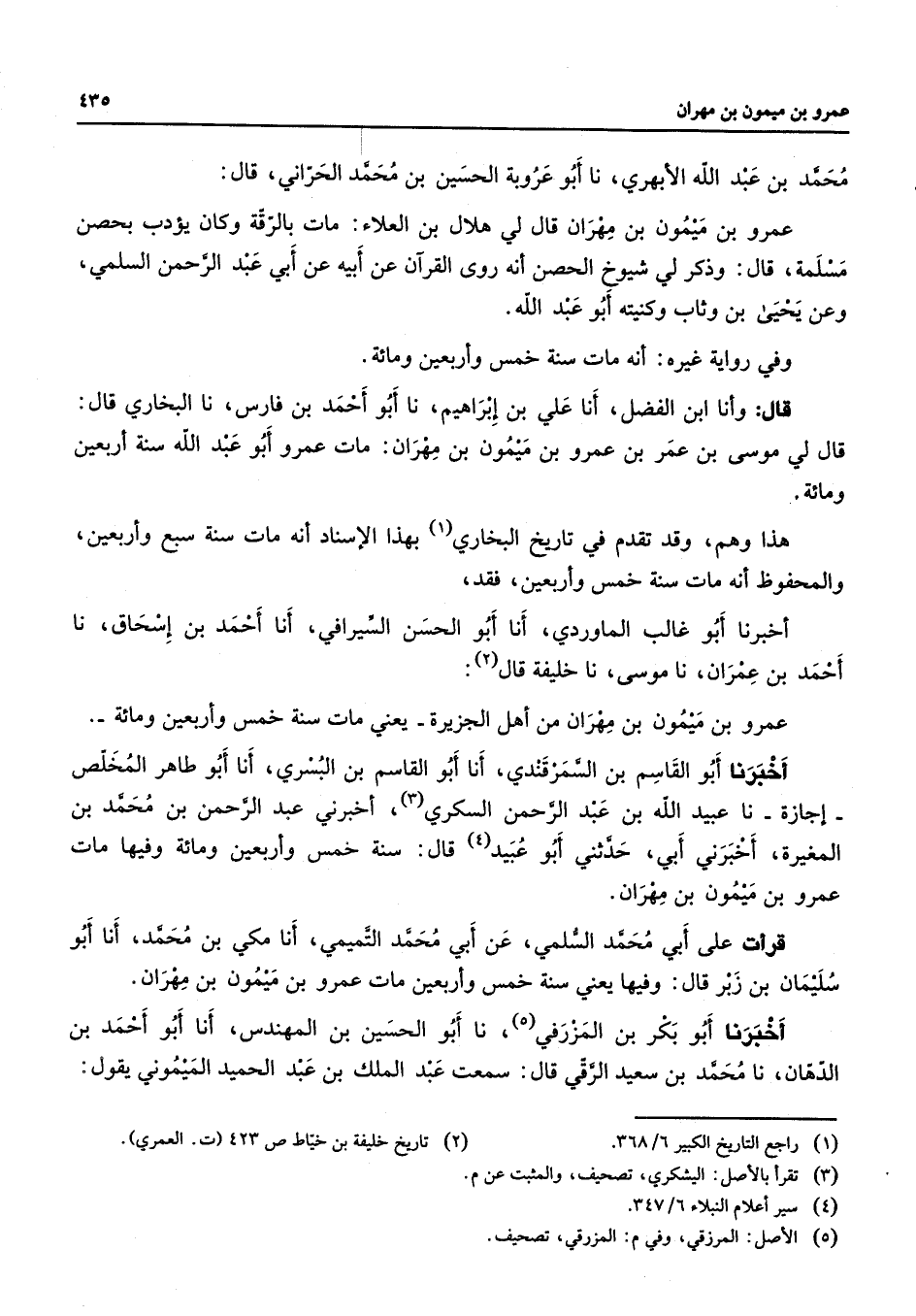 محمد بن عبد الله الأبهري نا أبو عروبة الحسين بن محمد الحراني قال عمرو بن ميمون بن مهران قال لي هلال بن العلاء مات بالرقة وكان يؤدب بحصن مسلمة قال وذكر لي شيوخ الحصن أنه روى القرآن عن أبيه عن أبي عبد الرحمن السلمي وعن يحيى بن وثاب وكنيته أبو عبد الله وفي رواية غيره أنه مات سنة خمس وأربعين ومائة قال وأنا ابن الفضل أنا علي بن إبراهيم نا أبو أحمد بن فارس نا البخاري قال قال لي موسى بن عمر بن عمرو بن ميمون بن مهران مات عمرو أبو عبد الله سنة أربعين ومائة هذا وهم وقد تقدم في تاريخ البخاري (1) بهذا الإسناد أنه مات سنة سبع وأربعين والمحفوظ أنه مات سنة خمس وأربعين فقد أخبرنا أبو غالب الماوردي أنا أبو الحسن السيرافي أنا أحمد بن إسحاق نا أحمد بن عمران نا موسى نا خليفة قال (2) عمرو بن ميمون بن مهران من أهل الجزيرة يعني مات سنة خمس وأربعين ومائة أخبرنا أبو القاسم بن السمرقندي أنا أبو القاسم بن البسري أنا أبو طاهر المخلص إجازة نا عبيد الله بن عبد الرحمن السكري (3) أخبرني عبد الرحمن بن محمد بن المغيرة أخبرني أبي حدثني أبو عبيد (4) قال سنة خمس وأربعين ومائة وفيها مات عمرو بن ميمون بن مهران قرأت على أبي محمد السلمي عن أبي محمد التميمي أنا مكي بن محمد أنا أبو سليمان بن زبر قال وفيها يعني سنة خمس وأربعين مات عمرو بن ميمون بن مهران أخبرنا أبو بكر بن المزرفي (5) نا أبو الحسين بن المهندس أنا أبو أحمد بن الدهان نا محمد بن سعيد الرقي قال سمعت عبد الملك بن عبد الحميد الميموني يقول