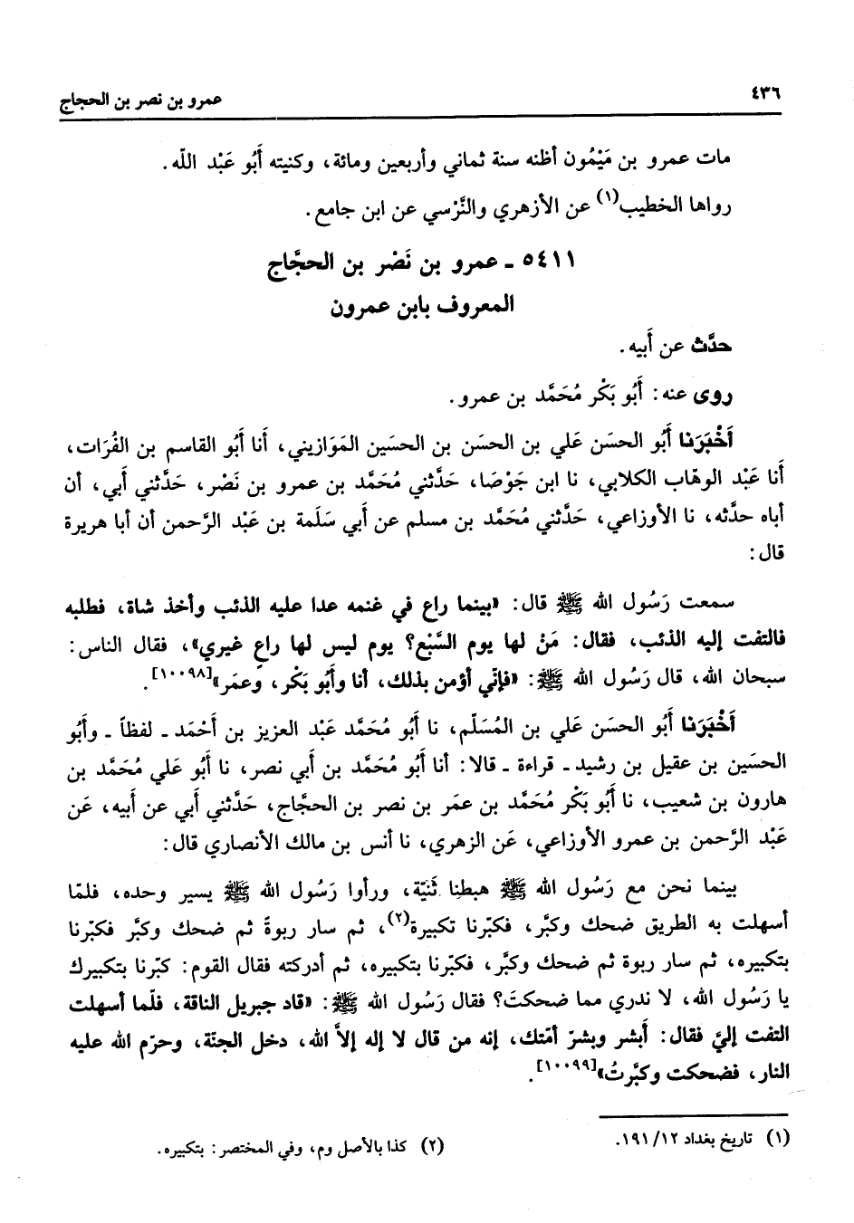 5411 - عمرو بن نصر بن الحجاج المعروف بابن عمرون حدث عن أبيه روى عنه أبو بكر محمد بن عمرو أخبرنا أبو الحسن علي بن الحسن بن الحسين الموازيني أنا أبو القاسم بن الفرات أنا عبد الوهاب الكلابي نا ابن جوصا حدثني محمد بن عمرو بن نصر حدثني أبي أن أباه حدثه نا الأوزاعي حدثني محمد بن مسلم عن أبي سلمة بن عبد الرحمن أنا أبا هريرة قال سمعت رسول الله (صلى الله عليه وسلم) قال بينما راع في غنمه عدا عليه الذئب وأخذ شاة فطلبه فالتفت إليه الذئب فقال من لها يوم السبع يوم ليس لها راع غيري فقال الناس سبحان الله قال رسول الله (صلى الله عليه وسلم) فإني أؤمن بذلك أنا وأبو بكر وعمر أخبرنا أبو الحسن علي بن المسلم نا أبو محمد عبد العزيز بن أحمد لفظا وأبو الحسين بن عقيل بن رشيد قراءة قالا أنا أبو محمد بن أبي نصر نا أبو علي محمد بن هارون بن شعيب نا أبو بكر محمد بن عمر بن نصر بن الحجاج حدثني أبي عن أبيه عن عبد الرحمن بن عمرو الأوزاعي عن الزهري نا أنس بن مالك الأنصاري قال بينما نحن مع رسول الله (صلى الله عليه وسلم) هبطنا ثنية ورأوا رسول الله (صلى الله عليه وسلم) يسير وحده فلما أسهلت به الطريق ضحك وكبر فكبرنا تكبيرة (2) ثم سارربوة ثم ضحك وكبر فكبرنا بتكبيره ثم سار ربوة ثم ضحك وكبر فكبرنا بتكبيره ثم أدركته فقال القوم كبرنا بتكبيرك يا رسول الله لا ندري مما ضحكت فقال رسول الله (صلى الله عليه وسلم) قاد جبريل الناقة فلما أسهلت التفت إلي فقال أبشر وبشر أمتك إنه من قال لا إله إلا الله دخل الجنة وحرم الله عليه النار فضحكت وكبرت