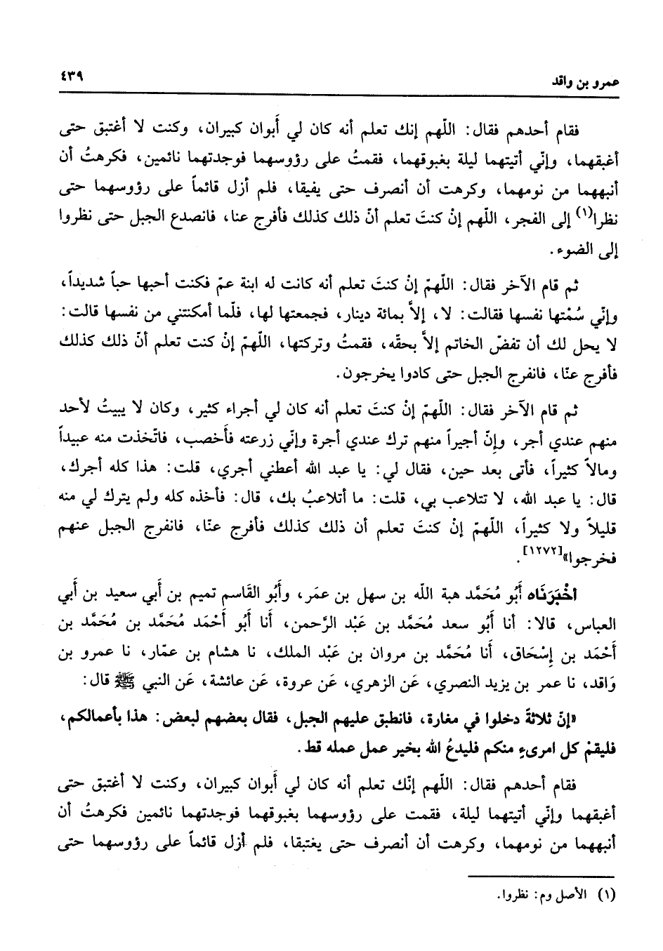 [1272] أخبرناه أبو محمد هب الله بن سهل بن عمر وأبو القاسم تميم بن أبي سعيد بن أبي العباس قالا أنا أبو سعد محمد بن عبد الرحمن أنا أبو أحمد محمد بن محمد بن أحمد بن إسحاق أنا محمد بن مروان بن عبد الملك نا هشام بن عمار نا عمرو بن واقد نا عمر بن يزيد النصري عن الزهري عن عروة عن عائشة عن النبي (صلى الله عليه وسلم) قال إن ثلاثة دخلوا في مغارة فانطلق عليهم الجبل فقال بعضهم لبعض هذا بأعمالكم فليقم كل امرئ منكم فليدع الله بخير عمل عمله قط فقام أحدهم فقال اللهم إنك تعلم أنه كان لي أبوان كبيران وكنت لا أغتبق حتى أغبقهما وإني أتيتهما ليلة فقمت على رؤوسهما بغبوقهما فوجدتهما نائمين فكرهت أن أنبههما من نومهما وكرهت أن أنصرف حتى يغتبقا فلم أزل قائما على رؤوسهما حتى