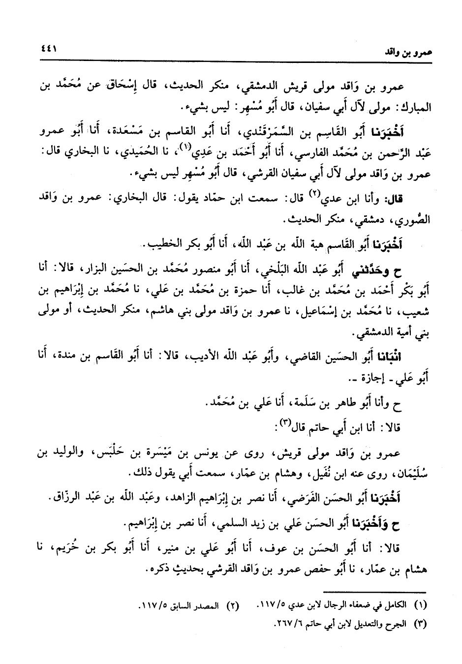 عمرو بن واقد مولى قريش الدمشقي منكر الحديث قال إسحاق عن محمد بن المبارك مولى لآل أبي سفيان قال أبو مسهر ليس بشئ أخبرنا أبو القاسم بن السمرقندي أنا أبو القاسم بن مسعدة أنا أبو عمرو عبد الرحمن بن محمد الفارسي أنا أبو أحمد بن عدي (1) نا الحميدي نا البخاري قال عمرو بن واقد مولى لآل أبي سفيان القرشي قال أبو مسهر ليس بشئ قال وأنا ابن عدي (2) قال سمعت ابن حماد يقول قال البخاري عمرو بن واقد الصوري دمشقي منكر الحديث أخبرنا أبو القاسم هبة الله بن عبد الله أنا أبو بكر الخطيب ح وحدثني أبو عبد الله البلخي أنا أبو منصور محمد بن الحسين البزار قالا أنا أبو بكر أحمد بن محمد بن غالب أنا حمزة بن محمد بن علي نا محمد بن إبراهيم بن شعيب نا محمد بن إسماعيل نا عمرو بن واقد مولى بني هاشم منكر الحديث أو مولى بني أمية الدمشقي أنبأنا أبو الحسين القاضي وأبو عبد الله الأديب قالا أنا أبو القاسم بن مندة أنا أبو علي إجازة ح وأنا أبو طاهر بن سلمة أنا علي بن محمد قالا أنا ابن أبي حاتم قال (3) عمرو بن واقد مولى قريش روى عن يونس بن ميسرة بن حلبس والوليد بن سليمان روى عنه ابن نفيل وهشام بن عمار سمعت أبي يقول ذلك أخبرنا أبو الحسن الفرضي أنا نصر بن إبراهيم الزاهد وعبد الله بن عبد الرزاق ح وأخبرنا أبو الحسن علي بن زيد السلمي أنا نصر بن إبراهيم قالا أنا أبو الحسن بن عوف أنا أبو علي بن منير أنا أبو بكر بن خريم نا هشام بن عمار نا أبو حفص عمرو بن واقد القرشي بحديث ذكره