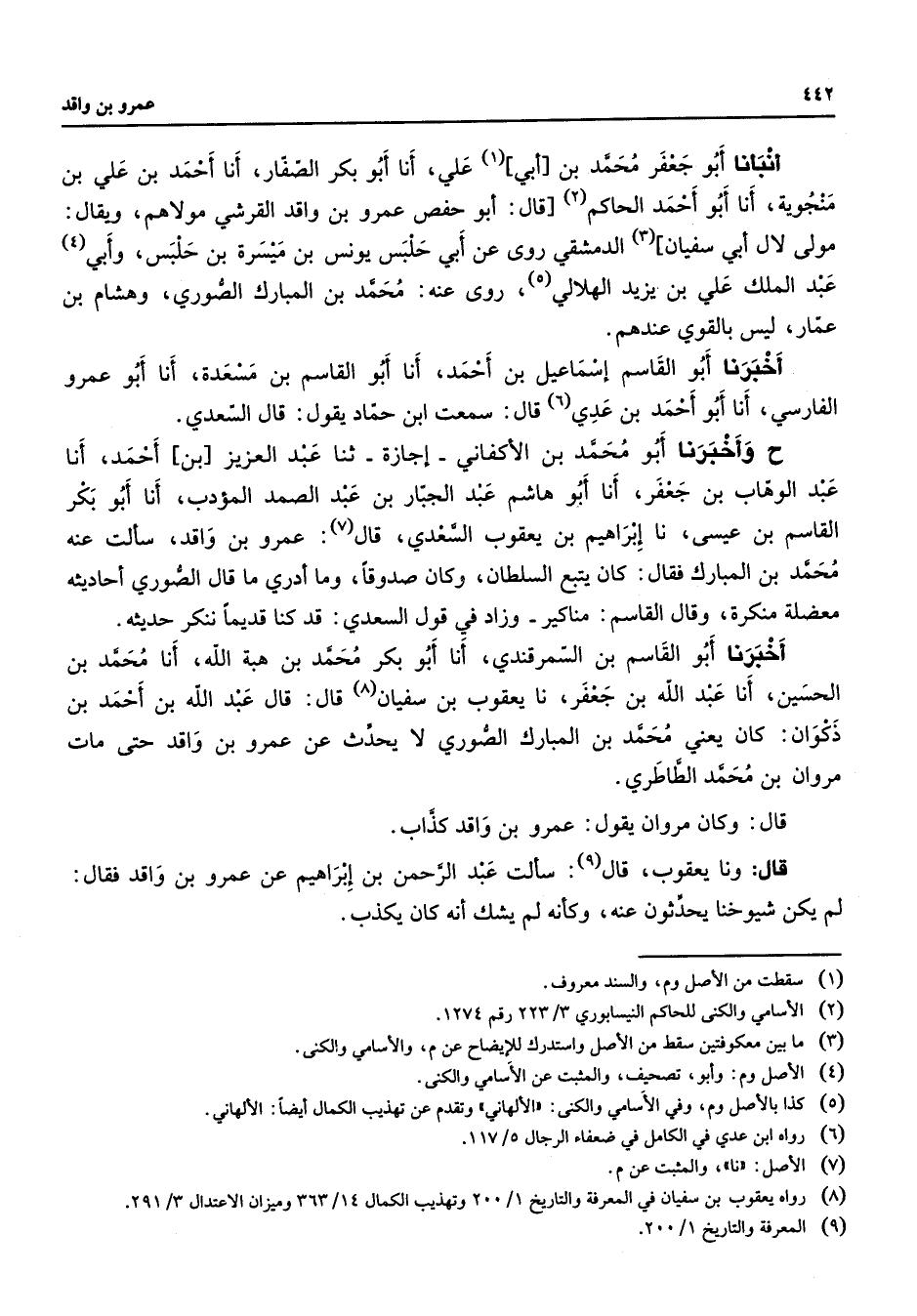 أنبأنا أبو جعفر محمد بن أبي (1) علي أنا أبو بكر الصفار أنا أحمد بن علي بن منجوية أنا أبو أحمد الحاكم (2) قال أبو حفص عمرو بن واقد القرشي مولاهم ويقال مولى لال أبي سفيان (3) الدمشقي روى عن أبي حلبس يونس بن ميسرة بن حلبس وأبي (4) عبد الملك علي بن يزيد الهلالي (5) روى عنه محمد بن المبارك الصوري وهشام بن عمار ليس بالقوي عندهم أخبرنا أبو القاسم إسماعيل بن أحمد أنا أبو القاسم بن مسعدة أنا أبو عمرو الفارسي أنا أبو أحمد بن عدي (6) قال سمعت ابن حماد يقول قال السعدي ح وأخبرنا أبو محمد بن الأكفاني إجازة ثنا عبد العزيز بن أحمد أنا عبد الوهاب بن جعفر أنا أبو هاشم عبد الجبار بن عبد الصمد المؤدب أنا أبو بكر القاسم بن عيسى نا إبراهيم بن يعقوب السعدي قال (7) عمرو بن واقد سألت عنه محمد بن المبارك فقال كان يتبع السلطان وكان صدوقا وما أدري ما قال الصوري أحاديثه معضلة منكرة وقال القاسم مناكير وزاد في قول السعدي قد كنا قديما ننكر حديثه أخبرنا أبو القاسم بن السمرقندي أنا أبو بكر محمد بن هبة الله أنا محمد بن الحسين أنا عبد الله بن جعفر نا يعقوب بن سفيان (8) قال قال عبد الله بن أحمد بن ذكوان كان يعني محمد بن المبارك الصوري لا يحدث عن عمرو بن واقد حتى مات مروان بن محمد الطاطري قال وكان مروان يقول عمرو بن واقد كذاب قال ونا يعقوب قال (9) سألت عبد الرحمن بن إبراهيم عن عمرو بن واقد فقال لم يكن شيوخنا يحدثون عنه وكأنه لم يشك أنه كان يكذب