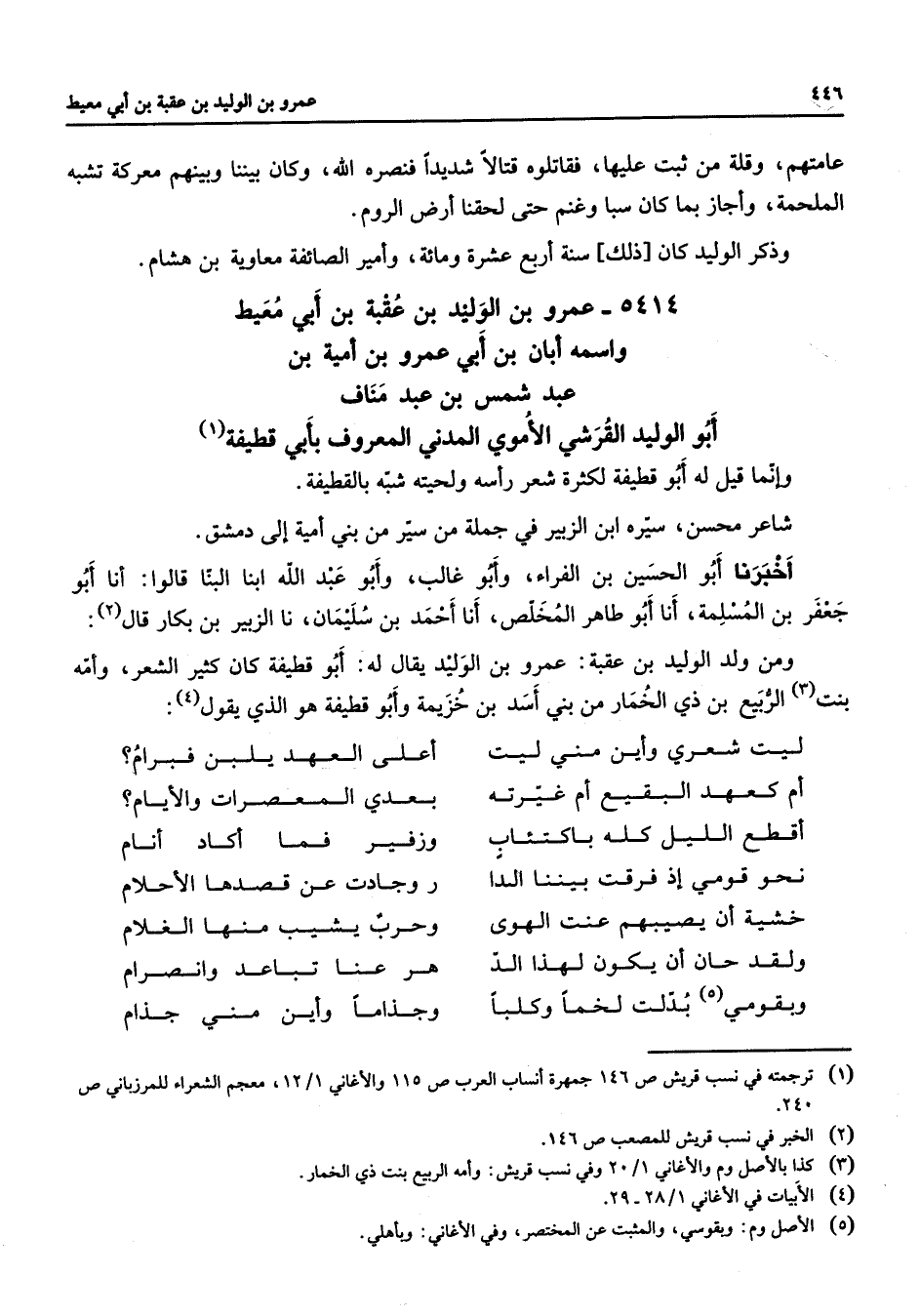 5414 - عمرو بن الوليد بن عقبة بن أبي معيط واسمه أبان بن أبي عمرو بن أمية بن عبد شمس بن عبد مناف أبو الوليد القرشي الأموي المدني المعروف بأبي قطيفة (1) وإنما قيل له أبو قطيفة لكثرة شعر رأسه وليحته شبه بالقطيفة شاعر محسن سيره ابن الزبير في جملة من سير من بني أمية إلى دمشق أخبرنا أبو الحسين بن الفراء وأبو غالب وأبو عبد الله ابنا البنا قالوا أنا أبو جعفر بن المسلمة أنا أبو طاهر المخلص أنا أحمد بن سليمان نا الزبير بن بكار قال (2) ومن ولد الوليد بن عقبة عمرو بن الوليد يقال له أبو قطيفة كان كثير الشعر وأمه بنت (3) الربيع بن ذي الخمار من بين أسد بن خزيمة وأبو قطيفة هو الذي يقول (4) * ليت شعري وأين مني ليت * أعلى العهد يلبن فبرام أم كعهد البقيع أم غيرته * بعدي المعصرات والأيام أقطع الليل كله باكتئاب * وزفير فما أكاد أنام نحو قومي إذ فرقت بيننا الدار * وجادت عن قصدها الأحلام خشية أن يصيبهم عنت الهوى * وحرب يشيب منها الغلام ولقد حان أن يكون لهذا الدهر * عنا تباعد وانصرام وبقومي (5) بدلت لخما وكلبا * وجذاما وأين مني جذام