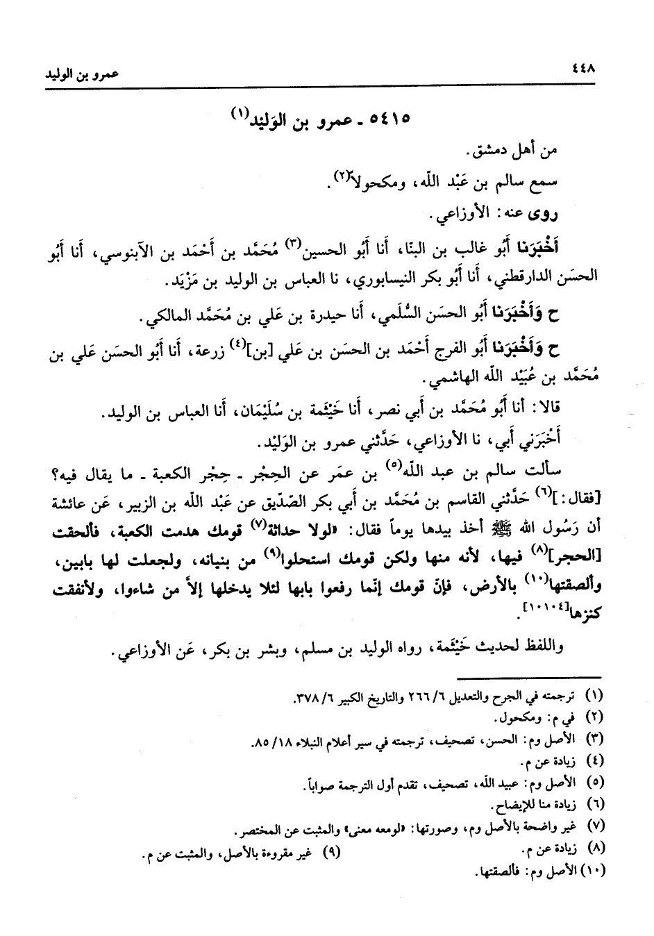 5415 - عمرو بن الوليد (1) من أهل دمشق سمع سالم بن عبد الله ومكحولا (2) روى عنه الأوزاعي أخبرنا أبو غالب بن البنا أنا أبو الحسين (3) محمد بن أحمد بن الآبنوسي أنا أبو الحسن الدارقطني أنا أبو بكر النيسابوري نا العباس بن الوليد بن مزيد ح وأخبرنا أبو الحسن السلمي أنا حيدرة بن علي بن محمد المالكي ح وأخبرنا أبو الفرج أحمد بن الحسن بن علي بن (4) زرعة أنا أبو الحسن علي بن محمد بن عبيد الله الهاشمي قالا أنا أبو محمد بن أبي نصر أنا خيثمة بن سليمان أنا العباس بن الوليد أخبرني أبي نا الأوزاعي حدثني عمرو بن الوليد سألت سالم بن عبد الله (5) بن عمر عن الحجر حجر الكعبة ما يقال فيه فقال (6) حدثني القاسم بن محمد بن أبي بكر الصديق عن عبد الله بن الزبير عن عائشة أن رسول الله (صلى الله عليه وسلم) أخذ بيدها يوما فقال لولا حداثة (7) قومك هدمت الكعبة فألحقت الحجر (8) فيها لأنه منها ولكن قومك استحلوا (9) من بنيانه ولجعلت لها بابين وألصقتها (10) بالأرض فإن قومك إنما رفعوا بابها لئلا يدخلها إلا من شاءوا ولأنفقت كنزها