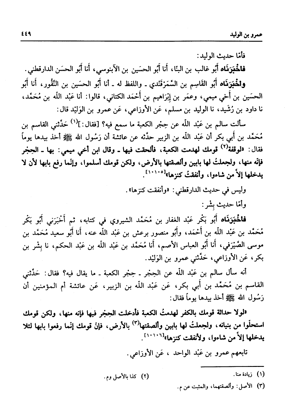فأما حديث الوليد فأخبرناه أبو غالب بن البنا أنا أبو الحسين بن الآبنوسي أنا أبو الحسن الدارقطني وأخبرناه أبو القاسم بن السمرقندي واللفظ له أنا أبو الحسين بن النقور أنا أبو الحسين بن أخي ميمي وعمر بن إبراهيم بن أحمد الكتاني قالوا أنا عبد الله بن محمد نا داود بن رشيد نا الوليد بن مسلم عن الأوزاعي عن عمرو بن الوليد قال سألت سالم بن عبد الله عن حجر الكعبة ما سمع فيه فقال (1) حدثني القاسم بن محمد بن أبي بكر أن عبد الله بن الزبير حدثه عن عائشة أن رسول الله (صلى الله عليه وسلم) أخذ بيدها يوما فقال لوقفة (2) قومك لهدمت الكعبة فألحقت فيها وقال ابن أخي ميمي بها الحجر فإنه منها ولجعلت لها بابين وألصقتها بالأرض ولكن قومك أسلموا وإنما رفع بابها لأن لا يدخلها إلا من شاءوا وأنفقت كنزها
