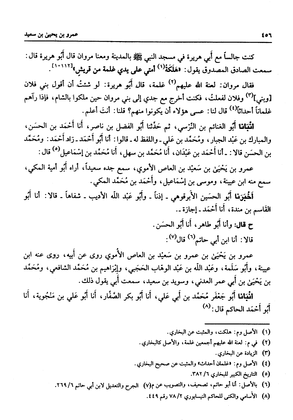 [10112] فقال مروان لعنة الله عليهم غلمة قال أبو هريرة لو شئت أن أقول بني فلان وبني (3) وفلان لفعلت فكنت أخرج مع جدي إلى بني مروان حين ملكوا بالشام فإذا رآهم غلمانا أحداثا (4) قال لنا عسى هؤلاء أن يكونوا منهم قلنا أنت أعلم أنبأنا أبو الغنائم بن النرسي ثم حدثنا أبو الفضل بن ناصر أنا أحمد بن الحسن والمبارك بن عبد الجبار ومحمد بن علي واللفظ له قالوا أنا أبو أحمد زاد أحمد ومحمد بن الحسن قالا أنا أحمد بن عبدان أنا محمد بن سهل أنا محمد بن إسماعيل قال عمرو بن يحيى بن سعيد بن العاص الأموي سمع جده سعيدا أراه أبو أمية المكي سمع منه ابن عيينة وموسى بن إسماعيل وأحمد بن محمد المكي أخبرنا أبو الحسين الأبرقوهي إذنا وأبو عبد الله الأديب شفاها قالا أنا أبو القاسم بن مندة أنا أحمد إجازة ح قال وأنا أبو طاهر أنا أبو الحسن قالا أنا ابن أبي حاتم (6) قال (7) عمرو بن يحيى بن عمرو بن سعيد بن العاص الأموي روى عن أبيه روى عنه ابن عيينة وأبو سلمة وعبد الله بن عبد الوهاب الحجبي وإبراهيم بن محمد الشافعي ومحمد بن يحيى بن أبي عمر العدني وسويد بن سعيد سمعت أبي يقول ذلك أنبأنا أبو جعفر محمد بن أبي علي أنا أبو بكر الصفار أنا أبو علي بن منجوية أنا أبو أحمد الحاكم قال (8)