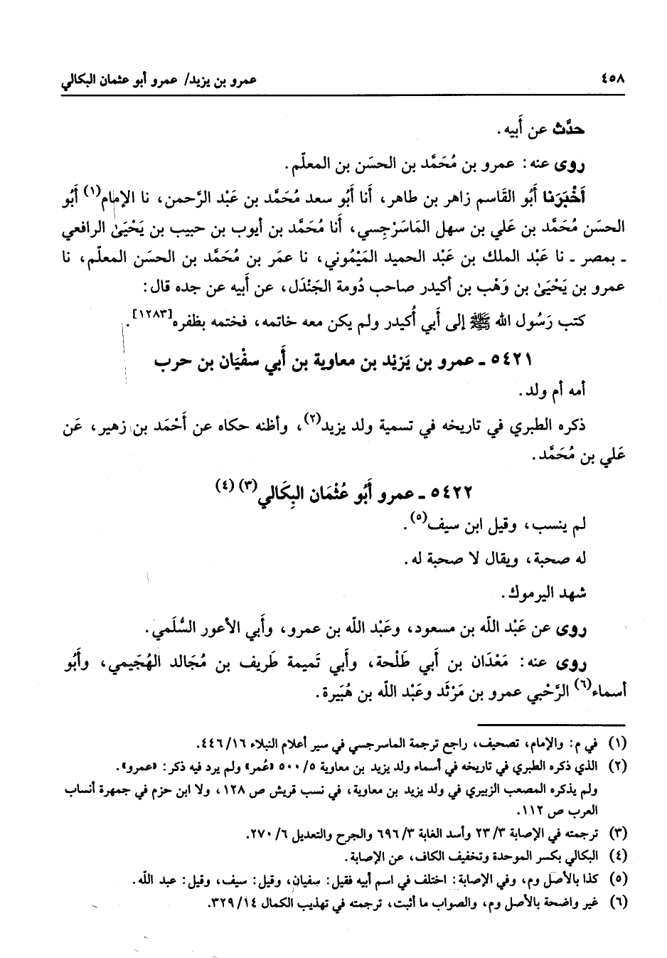 5422 - عمرو أبو عثمان البكالي (3) (4) لم ينسب وقيل ابن سيف (5) له صحبة ويقال لا صحبة له شهد اليرموك روى عن عبد الله بن مسعود وعبد الله بن عمرو وأبي الأعور السلمي روى عنه معدان بن أبي طلحة وأبي تميمة طريف بن مجالد الهجيمي وأبو أسماء (6) الرحبي عمرو بن مرثد وعبد الله بن هبيرة