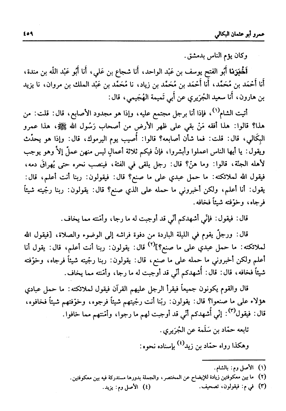 وكان يؤم الناس بدمشق أخبرنا أبو الفتح يوسف بن عبد الواحد أنا شجاع بن علي أنا أبو عبد الله بن مندة أنا أحمد بن محمد أنا أحمد بن محمد بن زياد نا محمد بن عبد الملك بن مروان نا يزيد بن هارون أنا سعيد الجريري عن أبي تميمة الهجيمي قال أتيت الشام (1) فإذا أنا برجل مجتمع عليه وإذا هو مجدود الأصابع قال قلت من هذا قالوا هذا أفقه من بقي على ظهر الأرض من أصحاب رسول الله (صلى الله عليه وسلم) هذا عمرو البكالي قال قلت فما شأن أصابعه قالوا أصيب يوم اليرموك قال وإذا هو يحدث ويقال يا أيها الناس اعملوا وأبشروا فإن فيكم ثلاثة أعمال ليس منهن عمل إلا وهو يوجب لأهله الجنة قالوا وما هن قال رجل يلقى في الفئة فينصب نحره حتى يهراق دمه فيقول الله لملائكته ما حمل عبدي على ما صنع قال فيقولون ربنا أنت أعلم قال يقول أنا أعلم ولكن أخبروني ما حمله على الذي صنع قال يقولون ربنا رجيته شيئا فرجاه وخوفته شيئا فخافه قال فيقول فإني أشهدكم أني قد أوجبت له ما رجا وأمنته مما يخاف قال ورجل يقوم في الليلة الباردة من دفوة فراشه إلى الوضوء والصلاة فيقول الله لملائكته ما حمل عبدي على ما صنع (2) قال يقولون ربنا أنت أعلم قال يقول أنا أعلم ولكن أخبروني ما حمله على ما صنع قال يقولون ربنا رجيته شيئا فرجاه وخوفته شيخا فخافه قال قال أشهدكم أني قد أوجبت له مارجا وأمنته مما يخاف قال والقوم يكونون جميعا فيقرأ الرجل عليهم القرآن فيقول لملائكته ما حمل عبادي هؤلاء على ما صنعوا قال يقولون ربنا أنت رجيتهم شيئا فرجوه وخوفتهم شيئا فخافوه قال فيقول (3) إني أشهدكم أني قد أوجبت لهم ما رجوا وأمنتهم مما خافوا تابعه حماد بن سلمة عن الجريري وهكذا رواه حماد بن زيد (4) بإسناده نحوه