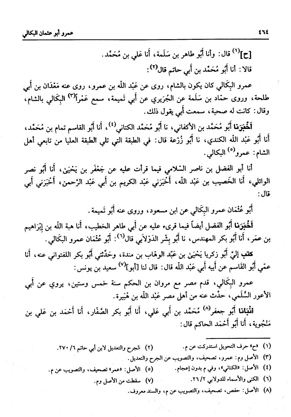 ح (1) قال وأنا أبو طاهر بن سلمة أنا علي بن محمد قالا أنا أبو محمد بن أبي حاتم قال (2) عمرو البكالي كان يكون بالشام روى عن عبد الله بن عمرو روى عنه معدان بن أبي طلحة وروى حماد بن سلمة عن الجريري عن أبي تميمة سمع عمرا (3) البكالي بالشام وقال كانت له صحبة سمعت أبي يقول ذلك أخبرنا أبو محمد بن الأكفاني نا أبو محمد الكتاني (4) أنا أبو القاسم تمام بن محمد أنا أبو عبد الله الكندي نا أبو زرعة قال في الطبقة التي تلي الطبقة العليا من تابعي أهل الشام عمرو (5) البكالي أنا أبو الفضل بن ناصر السلامي فيما قرأت عليه عن جعفر بن يحيى أنا أبو نصر الوائلي أنا الخصيب بن عبد الله أخبرني عبد الكريم بن أبي عبد الرحمن أخبرني أبي قال أبو عثمان عمرو البكالي عن ابن مسعود وروى عنه أبو تميمة أخبرنا أبو الفضل أيضا فيما قرئ عليه عن أبي طاهر الخطيب أنا هبة الله بن إبراهيم بن عمر أنا أبو بكر المهندس نا أبو بشر الدولابي قال (6) أبو عثمان عمرو البكالي كتب إلي أبو زكريا يحيى بن عبد الوهاب بن مندة وحدثني أبو بكر اللفتواني عنه أنا عمي أبو القاسم عن أبيه أبي عبد الله قال قال لنا أبو (7) سعيد بن يونس عمرو البكالي قدم مصر مع مروان بن الحكم سنة خمس وستين يروي عن أبي الأعور السلمي حدث عنه من أهل مصر عبد الله بن هبية أنبأنا أبو جعفر (8) محمد بن أبي علي أنا أبو بكر الصفار أنا أحمد بن علي بن منجوية أنا أبو أحمد الحاكم قال