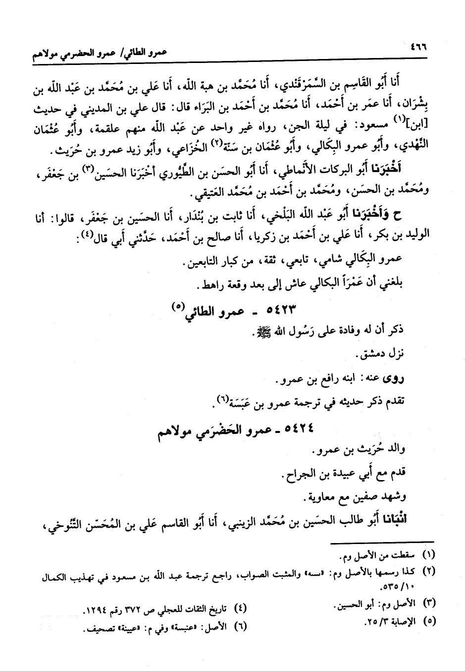 5423 - عمرو الطائي (5) ذكر أن له وفادة على رسول الله (صلى الله عليه وسلم) نزل دمشق روى عنه ابنه رافع بن عمرو تقدم ذكر حديثه في ترجمة عمرو بن عبسة (6)