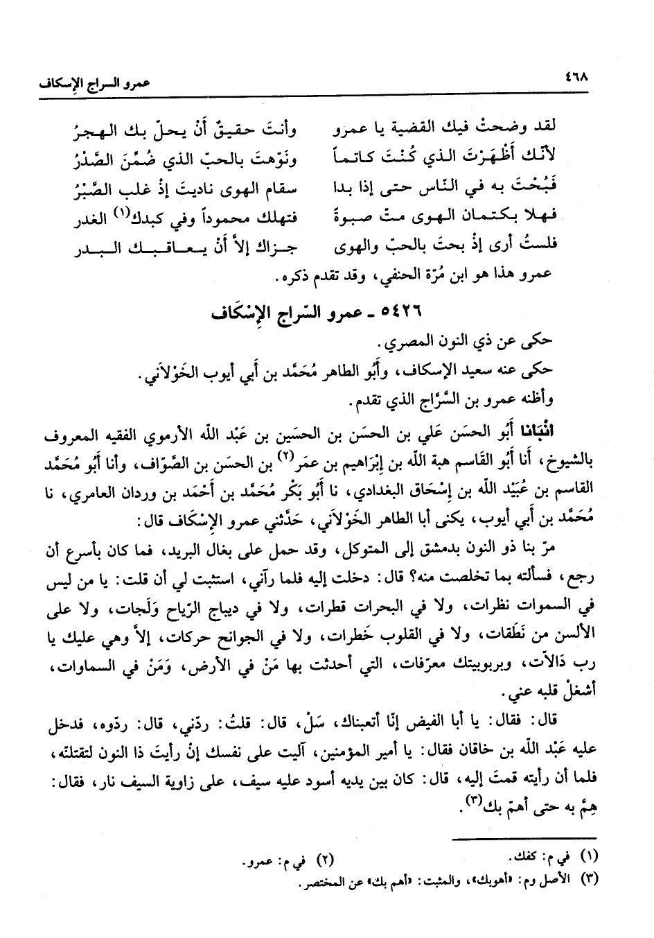 5426 - عمرو السراج الإسكاف حكى عن ذي النون المصري حكى عنه سعيد الإسكاف وأبو الطاهر محمد بن أبي أيوب الخولاني وأظنه عمرو بن السراج الذي تقدم أنبأنا أبو الحسن عل يبن الحسن بن الحسين بن عبد الله الأرموي الفقيه المعروف بالشيوخ أنا أبو القاسم هبة الله بن إبراهيم بن عمر (2) بن الحسن بن الصواف وأنا أبو محمد القاسم بن عبيد الله بن إسحاق البغدادي نا أبو بكر محمد بن أحمد بن وردان العامري نا محمد بن أبي أيوب يكنى أبا الطاهر الخولاني حدثني عمرو الإسكاف قال مر بنا ذو النون بدمشق إلى المتوكل وقد حمل على بغال البريد فما كان بأسرع أن رجع فسألته بما تخلصت منه قال دخلت إليه فلما رآني استثبت لي أن قلت يا من ليس في السموات نظرات ولا في البحرات قطرات ولا في ديباج الرياح ولجات ولا على الألسن من نطقات ولا في القلوب خطرات ولا في الجوانح حركات إلا وهي عليك يا رب دالات وبربوبيتك معرفات التي أحدثت بها من من في الأرض ومن في السماوات أشغل قلبه عني قال فقال يا أبا الفيض إنا أتعبناك سل قال قلت ردني قال ردوه فدخل عليه عبد الله بن خاقان فقال يا أمير المؤمنين آليت على نفسك إن رأيت ذا النون لتقتلنه فلما أن رأيته قمت إليه قال كان بين يديه أسود عليه سيف على زاوية السيف نار فقال هم به حتى أهم بك (3)