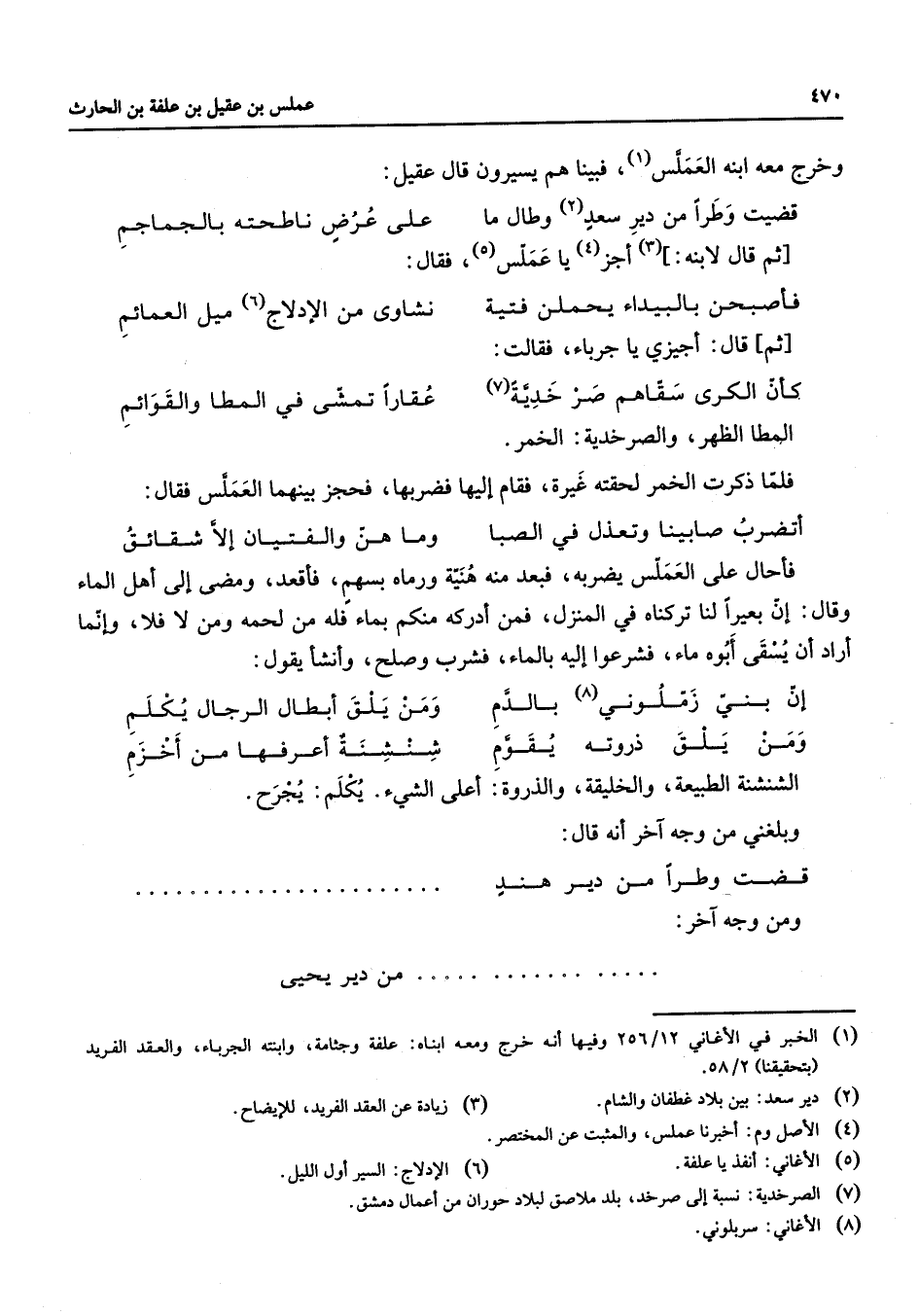 (1) الخبر في الأغاني 12 / 256 وفيها أنه خرج ومعه ابناه: علفة وجثامة وابنته الجرباء والعقد الفريد (بتحقيقنا) 2 / 58