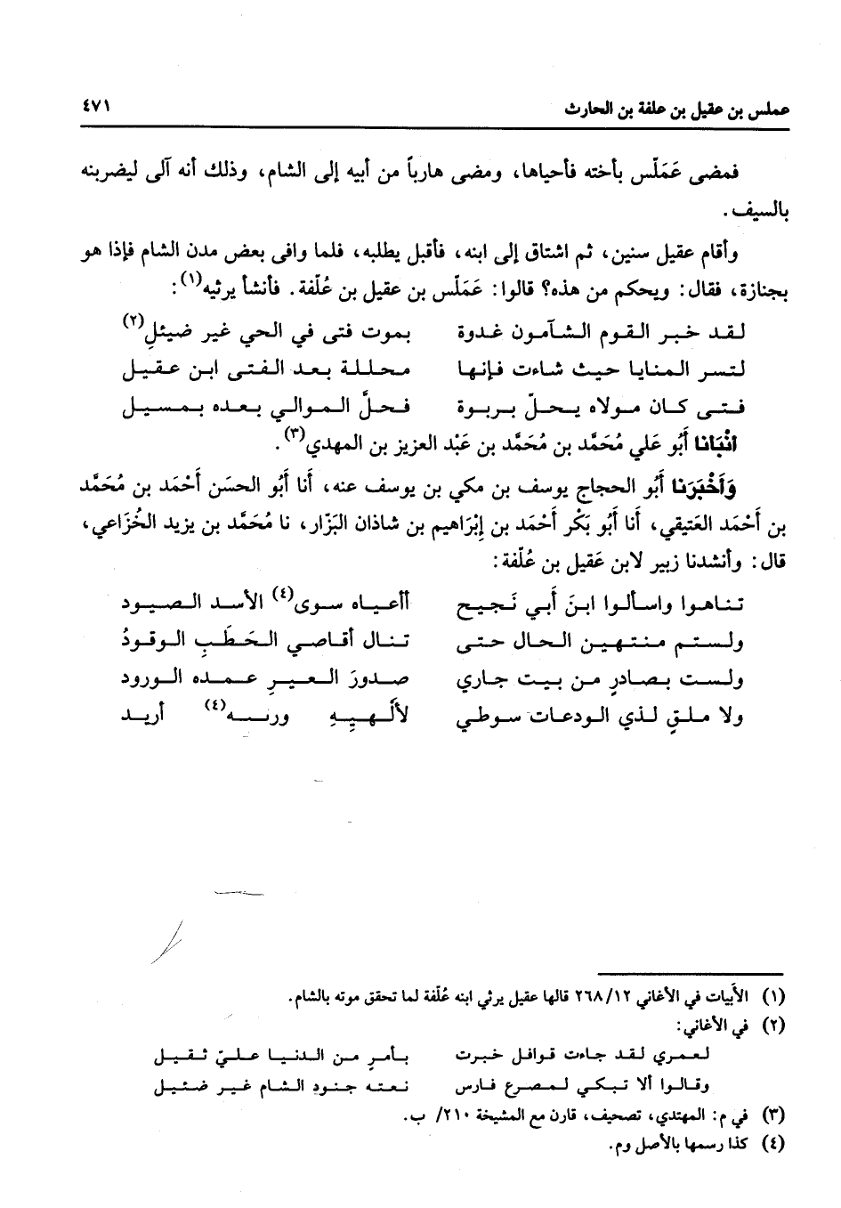 (2) في الأغاني: لعمري لقد جاءت قوافل خبرت * بأمر من الدنيا علي ثقيل وقالوا ألا تبكي لمصرع فارس * نعته جنود الشام غير ضئيل (3) في م: المهتدي تصحيف قارن مع المشيخة 210 / ب