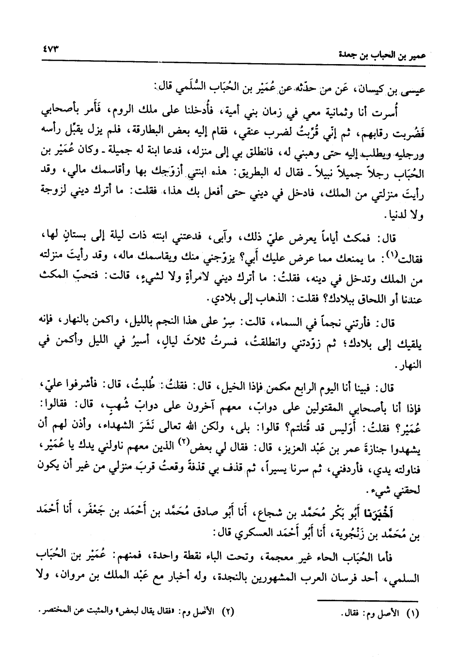 عيسى بن كيسان عن من حدثه عن عمير بن الحباب السلمي قال أسرت أنا وثمانية معي في زمان بني أمية فأدخلنا على ملك الروم فأمر بأصحابي فضربت رقابهم ثم إني قربت لضرب عنقي فقام إليه بعض البطارقة فلم يزل يقبل رأسه ورجليه ويطلب إليه حتى وهبني له فانطلق بي إلى منزله فدعا ابنة له جميلة وكان عمير بن الحباب رجلا جميلا نبيلا فقال له البطريق هذه ابنتي أزوجك بها وأقاسمك مالي وقد رأيت منزلتي من الملك فادخل في ديني حتى أفعل بك هذا فقلت ما أترك ديني لزوجة ولا لدنيا قال فمكث أياما يعرض علي ذلك وآبى فدعتني ابنته ذات ليلة إلى بستان لها فقالت (1) ما يمنعك مما عرض عليك أبي يزوجني منك ويقاسمك مالك وقد رأيت منزلته من الملك وتدخل في دينه فقلت ما أترك ديني لامرأة ولا لشئ قالت فتحب المكث عندنا أو اللحاق ببلادك فقلت الذهاب إلى بلادي قال فأرتني نجما في السماء قالت سر على هذا النجم بالليل واكمن بالنهار فإنه يلقيك إلا بلادك ثم زودتني وانطلقت فسرت ثلاث ليال أسير في الليل وأكمن في النهار قال فبينا أنا اليوم الرابع مكمن فإذا الخيل قال فقلت طلبت قال فأشرفوا علي فإذا أنا بأصحابي المقتولين على دواب معهم آخرون على دواب شهب قال فقالوا عمير فقلت أو ليس قد قتلتم قالوا بلى ولكن الله تعالى نشر الشهداء وأذن لهم أن يشهدوا جنازة عمر بن عبد العزيز قال فقال لي بعض (2) الذين معهم ناولني يدك يا عمير فناولته يدي فأردفني ثم سرنا يسيرا ثم قذف بي قذفة وقعت قرب منزلي من غير أن يكون لحقني شئ أخبرنا أبو بكر محمد بن شجاع أنا أبو صادق محمد بن أحمد بن جعفر أنا أحمد بن محمد بن زنجوية أنا أبو أحمد العسكري قال فأما الحباب الحاء غير معجمة وتحت الباء نقطة واحدة فمنهم عمير بن الحباب السلمي أحد فرسان العرب المشهورين بالنجدة وله أخبار مع عبد الملك بن مروان ولا
