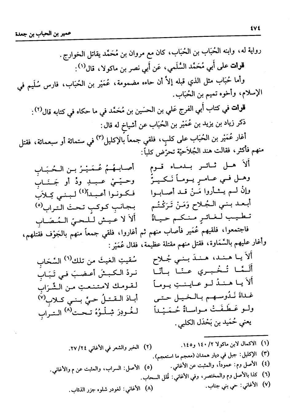 رواية له وابنه الحباب بن الحباب كان مع مروان بن محمد يقاتل الخوارج قرأت على أبي محمد السلمي عن أبي نصر بن ماكولا قال (1) وأما حباب مثل الذي قبله إلا أن حاءه مضمومة عمير بن الحباب فارس سليم في الإسلام وأخوه تميم بن الحباب قرأت في كتاب أبي الفرج علي بن الحسين بن محمد في ما حكاه في كتابه قال (2) ذكر زياد بن يزيد بن عمير بن الحباب عن أشياخ له قال أغار عمير بن الحباب على كلب فلقي جمعا بالإكليل (3) في ستمائة أو سبعمائة فقتل منهم فأكثر فقالت هند الجلاحية تحرض كلبا * ألا هل ثائر بدماء قوم * أصابهم عمير بن الحباب وهل في عامر يوما نكير * وحيي عبد ود أو جناب وإن لم يثأروا من قد أصابوا * فكونوا أعبدا (4) لبني كلاب أبعد بني الجلاح ومن تركتم * بجانب كوكب تحت التراب (5) تطيب لغائر منكم حياة * ألا لا عيس للحي المصاب * فاجتمعوا فلقيهم عمير فأصاب منهم ثم أغاروا فلقي جمعا منهم بالجوف فقتلهم وأغار عليهم بالسماوة فقتل منهم مقتلة عظيمة فقال عمير * ألا يا هند هند بني جلاح * سقيت الغيث من تلك (6) السحاب ألما تخبري عنا بأنا * نرد الكبش أعضب في تباب ألا يا هند لو عاينت يوما * لقومك لامتنعت من الشراب غداة ندوسهم بالخيل حتى * أباد القتل حي بني كلاب (7) ولو عطفت مواساة حميدا * لغودر شلوه تحت (8) التراب * يعني حميد بن بحدل الكلبي