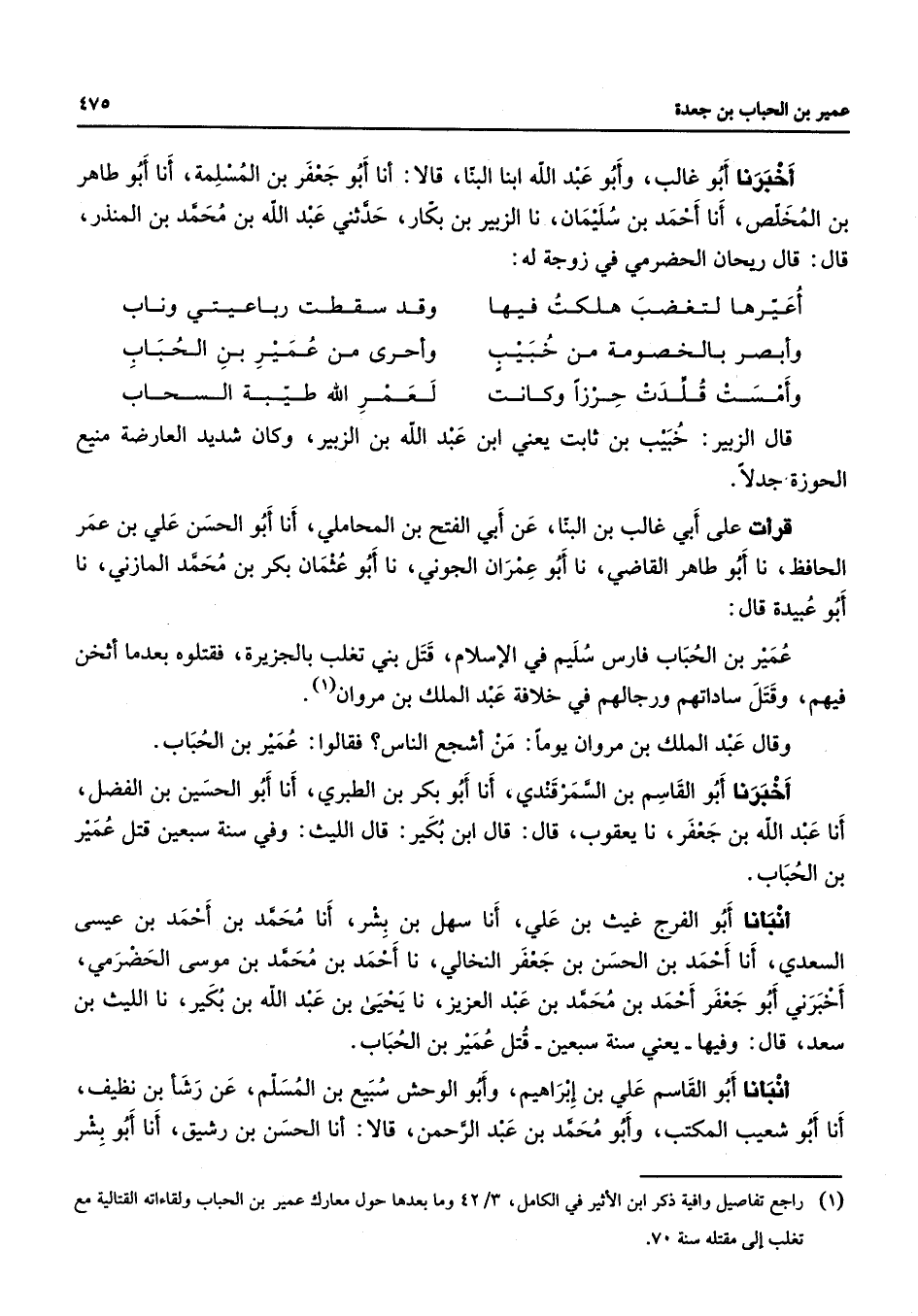 أخبرنا أبو غالب وأبو عبد الله ابنا البنا قالا أنا أبو جعفر بن المسلمة أنا أبو طاهر بن المخلص أنا أحمد بن سليمان نا الزبير بن بكار حدثني عبد الله بن محمد بن المنذر قال قال ريحان الحضرمي في زوجة له * أعيرها لتغضب هلكت فيها * وقد سقطت رباعيتي وناب وأبصر بالخصومة من خبيب * وأحرى من عمير بن الحباب وأمست قلدت حرزا وكانت * لعمر الله طيبة السحاب * قال الزبير خبيب بن ثابت يعني ابن عبد الله بن الزبير وكان شديد العارضة منيع الحوزة جدلا قرأت على أبي غالب بن البنا عن أبي الفتح بن المحاملي أنا أبو الحسن علي بن عمر الحافظ نا أبو طاهر القاضي نا أبو عمران الجوني نا أبو عثمان بكر بن محمد المازني نا أبو عبيدة قال عمير بن الحباب فارس سليم في الإسلام قتل بني تغلب بالجزيرة فقتلوه بعدما أثخن فيهم وقتل ساداتهم ورجالهم في خلافة عبد الملك بن مروان (1) وقال عبد الملك بن مروان يوما من أشجع الناس فقالوا عمير بن الحباب أخبرنا أبو القاسم بن السمرقندي أنا أبو بكر بن الطبري أنا أبو الحسين بن الفضل أنا عبد الله بن جعفر نا يعقوب قال قال ابن بكير قال الليث وفي سنة سبعين قتل عمير بن الحباب أنبأنا أبو الفرج غيث بن علي أنا سهل بن بشر أنا محمد بن أحمد بن عيسى السعدي أنا أحمد بن الحسن بن جعفر النخالي نا أحمد بن محمد بن موسى الحضرمي أخبرني أبو جعفر أحمد بن محمد بن عبد العزيز نا يحيى بن عبد الله بن بكير نا الليث بن سعد قال وفيها يعني سنة سبعين قتل عمير بن الحباب أنبأنا أبو القاسم علي بن إبراهيم وأبو الوحش سبيع بن المسلم عن رشأ بن نظيف أنا أبو شعيب المكتب وأبو محمد بن عبد الرحمن قالا أنا الحسن بن رشيق أنا أبو بشر