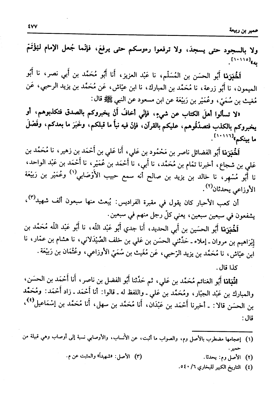 [10116] أخبرنا أبو الفضائل ناصر بن محمود بن علي أنا علي بن أحمد بن زهير نا محمد بن علي بن شجاع أخبرنا تمام بن محمد نا أبي نا أحمد بن عمير نا أحمد بن عبد الواحد نا أبو مسهر نا خالد بن يزيد بن صالح أنه سمع حبيب الأوصابي (1) وعمير بن ربيعة الأوزاعي يحدثان (2) أن كعب الأحبار كان يقول في مقبرة الفراديس يبعث منها سبعون ألف شهيد (3) يشفعون في سبعين سبعين يعني كل رجل منهم في سبعين أخبرنا أبو الحسين بن أبي الحديد أنا جدي أبو عبد الله نا أبو عبد الله محمد بن إبراهيم بن مروان إملاء حدثني الحسن بن علي بن خلف الصيدلاني نا هشام بن عمار نا ابن عياش نا محمد بن يزيد الرحبي عن مغيث بن سمي الأوزاعي وعثمان بن ربيعة كذا قال أنبأنا أبو الغنائم محمد بن علي ثم حدثنا أبو الفضل بن ناصر أنا أحمد بن الحسن والمبارك بن عبد الجبار ومحمد بن علي واللفظ له قالوا أنا أحمد زاد أحمد ومحمد بن الحسن قالا أخبرنا أحمد بن عبدان أنا محمد بن سهل أنا محمد بن إسماعيل (4) قال: