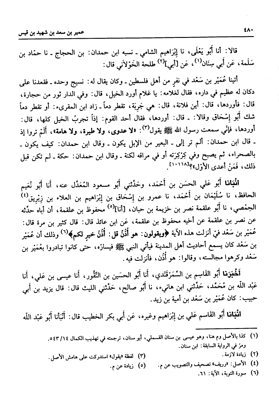 قالا أنا أبو يعلى نا إبراهيم الشامي نسبه ابن حمدان بن الحجاج نا حماد بن سلمة عن أبي سنان (1) عن أبي (2) طلحة الخولاني قال أتينا عمير بن سعد في نفر من أهل فلسطين وكان يقال له نسيج وحده فقعدنا على دكان له عظيم في داره فقال لغلامه يا غلام أورد الخيل قال وفي الدار ثور من حجارة قال فأوردها قال أين فلانة قال هي جربة تقطر دما زاد ابن المقرئ أو تقطر دما شك أبو إسحاق وقالا قال أوردها فقال أحد القوم إذا تجرب الخيل كلها قال أوردها فإني سمعت رسول الله (صلى الله عليه وسلم) يقول (3) لا عدوى ولا طيرة ولا هامة ألم تروا إذ قال ابن حمدان ألم تر إلى البعير من الإبل يكون وقال ابن حمدان كيف يكون بالصحراء ثم يصبح وفي كركرته أو في مراقه لكنة وقال ابن حمدان حكة لم تكن قبل ذلك فمن أعدى الأول