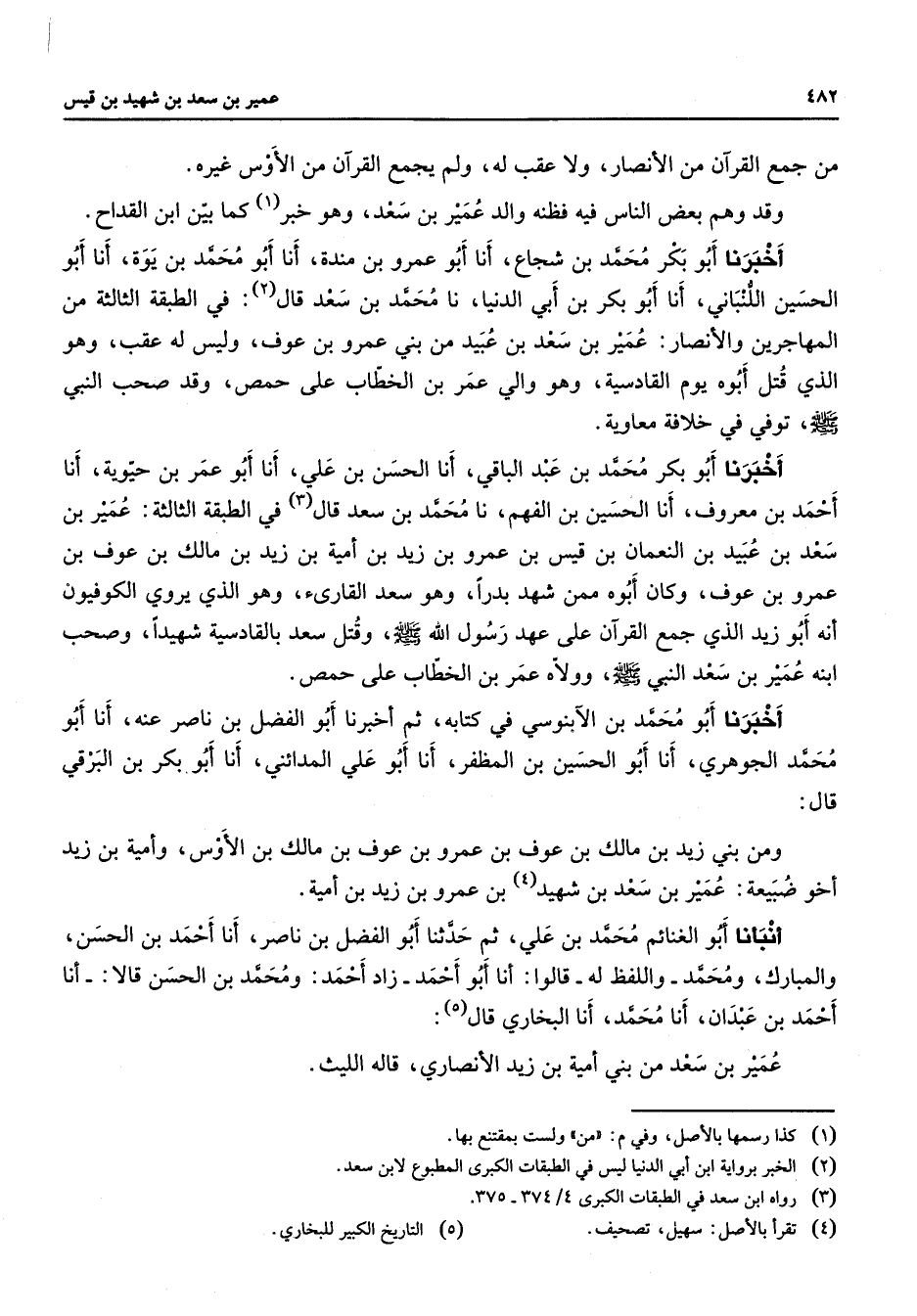 من جمع القرآن من الأنصار ولا عقب له ولم يجمع القرآن من الأوس غيره وقد وهم بعض الناس فيه فظنه والد عمير بن سعد وهو خبر (1) كما بين ابن القداح أخبرنا أبو بكر محمد بن شجاع أنا أبو عمرو بن مندة أنا أبو محمد بن يوة أنا أبو الحسين اللنباني أنا أبو بكر بن أبي الدنيا نا محمد بن سعد قال (2) في الطبقة الثالثة من المهاجرين والأنصار عمير بن سعد بن عبيد من بين عمرو بن عوف وليس له قب وهو الذي قتل أبوه يوم القادسية وهو والي عمر بن الخطاب على حمص وقد صحب النبي (صلى الله عليه وسلم) توفي في خلافة معاوية أخبرنا أبو بكر محمد بن عبد الباقي أنا الحسن بن علي أنا أبو عمر بن حيوية أنا أحمد بن معروف أنا الحسين بن الفهم نا محمد بن سعد قال (3) في الطبقة الثالثة عمير بن سعد بن عبيد بن النعمان بن قيس بن عمرو بن زيد بن أمية بن زيد بن مالك بن عوف بن عمرو بن عوف وكان أبوه ممن شهد بدرا وهو سعد القارئ وهو الذي يروي الكوفيون أنه أبو زيد الذي جمع القرآن على عهد رسول الله (صلى الله عليه وسلم) وقتل سعد بالقادسية شهيدا وصحب ابنه عمير بن سعد النبي (صلى الله عليه وسلم) وولاه عمر بن الخطاب على حمص أخبرنا أبو محمد بن الآبنوسي في كتابه ثم أخبرنا أبو الفضل بن ناصر عنه أنا أبو محمد الجوهري أنا أبو الحسين بن المظفر أنا أبو علي المدائني أنا أبو بكر بن البرقي قال ومن بني زيد بن مالك بن عوف بن عمرو بن عوف بن مالك بن الأوس وأمية بن زيد أخو ضبيعة عمير بن سعد بن شهيد (4) بن عمرو بن زيد بن أمية أنبأنا أبو الغنائم محمد بن علي ثم حدثنا أبو الفضل بن ناصر أنا أحمد بن الحسن والمبارك ومحمد واللفظ له قالوا أنا أبو أحمد زاد أحمد ومحمد بن الحسن قالا أنا أحمد بن عبدان أنا محمد أنا البخاري قال (5) عمير بن سعد من بني أمية بن زيد الأنصاري قاله الليث