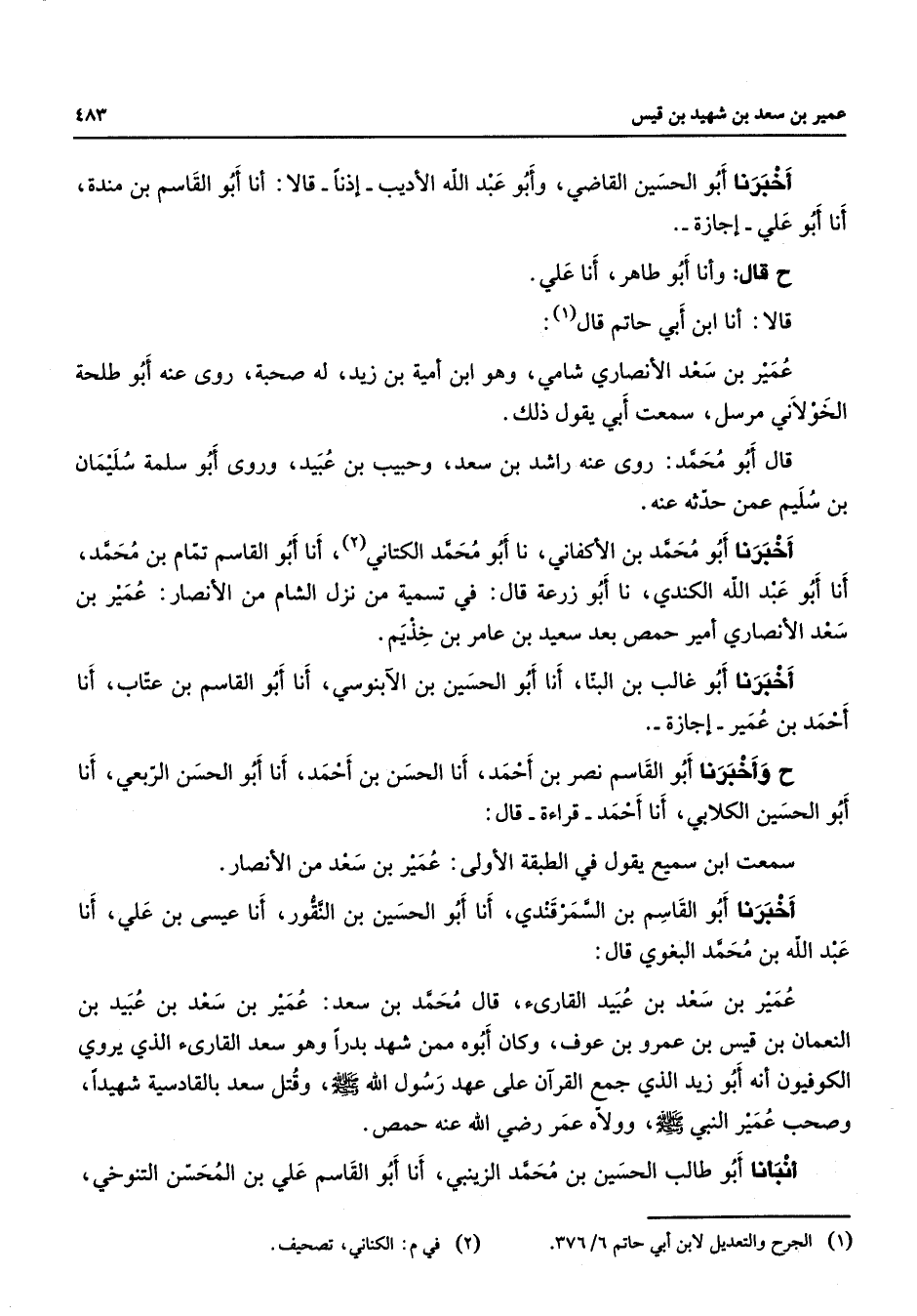 أخبرنا أبو الحسين القاضي وأبو عبد الله الأديب إذنا قالا أنا أبو القاسم بن مندة أنا أبو علي إجازة ح قال وأنا أبو طاهر أنا علي قالا أنا ابن أبي حاتم قال (1) عمير بن سعد الأنصاري شامي وهو ابن أمية بن زيد له صحبة روى عنه أبو طلحة الخولاني مرسل سمعت أبي يقول ذلك قال أبو محمد روى عنه راشد بن سعد وحبيب بن عبيد وروى أبو سلمة سليمان بن سليم عمن حدثه عنه أخبرنا أبو محمد بن الأكفاني نا أبو محمد الكتاني (2) أنا أبو القاسم تمام بن محمد أنا أبو عبد الله الكندي نا أبو زرعة قال في تسمية من نزل الشام من الأنصار عمير سعد الأنصاري أمير حمص بعد سعيد بن عامر بن خذيم أخبرنا أبو غالب بن البنا أنا أبو الحسين بن الآبنوسي أنا أبو القاسم بن عتاب أنا أحمد بن عمير إجازة ح وأخبرنا أبو القاسم نصر بن أحمد أنا الحسين بن أحمد أنا أبو الحسن الربعي أنا أبو الحسين الكلابي أنا أحمد قراءة قال سمعت ابن سميع يقول في الطبقة الأولى عمير بن سعد من الأنصار أخبرنا أبو القاسم بن السمرقندي أنا أبو الحسين بن النقور أنا عيسى بن علي أنا عبد الله بن محمد البغوي قال عمير بن سعد بن عبيد القارئ قال محمد بن سعد عمير بن سعد بن عبيد بن النعمان بن قيس بن عمرو بن عوف وكان أبوه ممن شهد بدرا وهو سعد القارئ الذي يروي الكوفيون أنه أبو زيد الذين جمع القرآن على عهد رسول الله (صلى الله عليه وسلم) وقتل سعد بالقادسية شهيدا وصحب عمير النبي (صلى الله عليه وسلم) وولاه عمر Bهـ حمص أنبأنا أبو طالب الحسين بن محمد الزينبي أنا أبو القاسم علي بن المحسن التنوخي