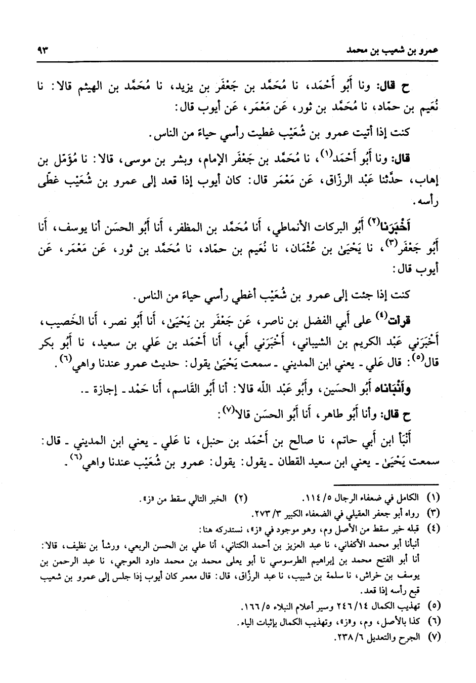 ح قال ونا أبو أحمد نا محمد بن جعفر بن يزيد نا محمد بن الهيثم قالا نا نعيم بن حماد نا محمد بن ثور عن معمر عن أيوب قال كنت إذا أتيت عمرو بن شعيب غطيت رأسي حياء من الناء قال ونا أبو أحمد (1) نا محمد بن جعفر الإمام وبشر بن موسى قالا نا مؤمل بن إهاب حدثنا عبد الرزاق عن معمر قال كان أيوب إذا قعد إلى عمرو بن شعيب غطى رأسه أخبرنا (2) أبو البركات الأنماطي أنا محمد بن المظفر أنا أبو الحسن أنا يوسف أنا أبو جعفر (3) نا يحيى بن عثمان نا نعيم بن حماد نا محمد بن ثور عن معمر عن أيوب قال كنت إذا جئت إلى عمرو بن شعيب أغطي رأسي حياء من الناس قرأت (4) على أبي الفضل بن ناصر عن جعفر بن يحيى أنا أبو نصر أنا الخصيب أخبرني عبد الكريم بن الشيباني أخبرني أبي أنا أحمد بن علي بن سعيد نا أبو بكر قال (5) قال علي يعني ابن المديني سمعت يحيى يقول حديث عمرو عندنا واهي (6) وأنبأناه أبو الحسين وأبو عبد الله قالا أنا أبو القاسم أنا حمد إجازة ح قال وأنا أبو طاهر أنا أبو الحسن قالا (7) أنبأ ابن أبي حاتم نا صالح بن أحمد بن حنبل نا علي يعني ابن المديني قال سمعت يحيى يعني ابن سعيد القطان يقول يقول عمرو بن شعيب عندنا واهي (6)