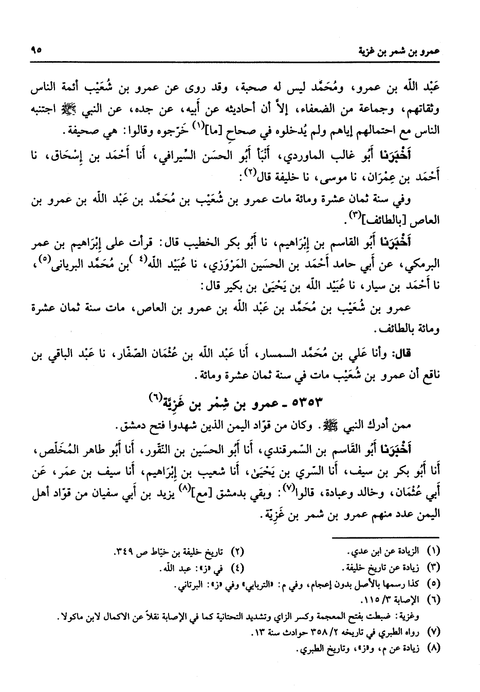 5353 - عمرو بن شمر بن غزية (6) ممن أدرك النبي (صلى الله عليه وسلم) وكان من قواد اليمن الذين شهدوا فتح دمشق أخبرنا أبو القاسم بن السمرقندي أنا أبو الحسين بن النقور أنا أبو طاهر المخلص أنا أبو بكر بن سيف أنا السري بن يحيى أنا شعيب بن إبراهيم أنا سيف بن عمر عن أبي عثمان وخالد وعبادة قالوا (7) وبقي بدمشق مع (8) يزيد بن أبي سفيان من قواد أهل اليمن عدد منهم عمرو بن شمر بن غزية