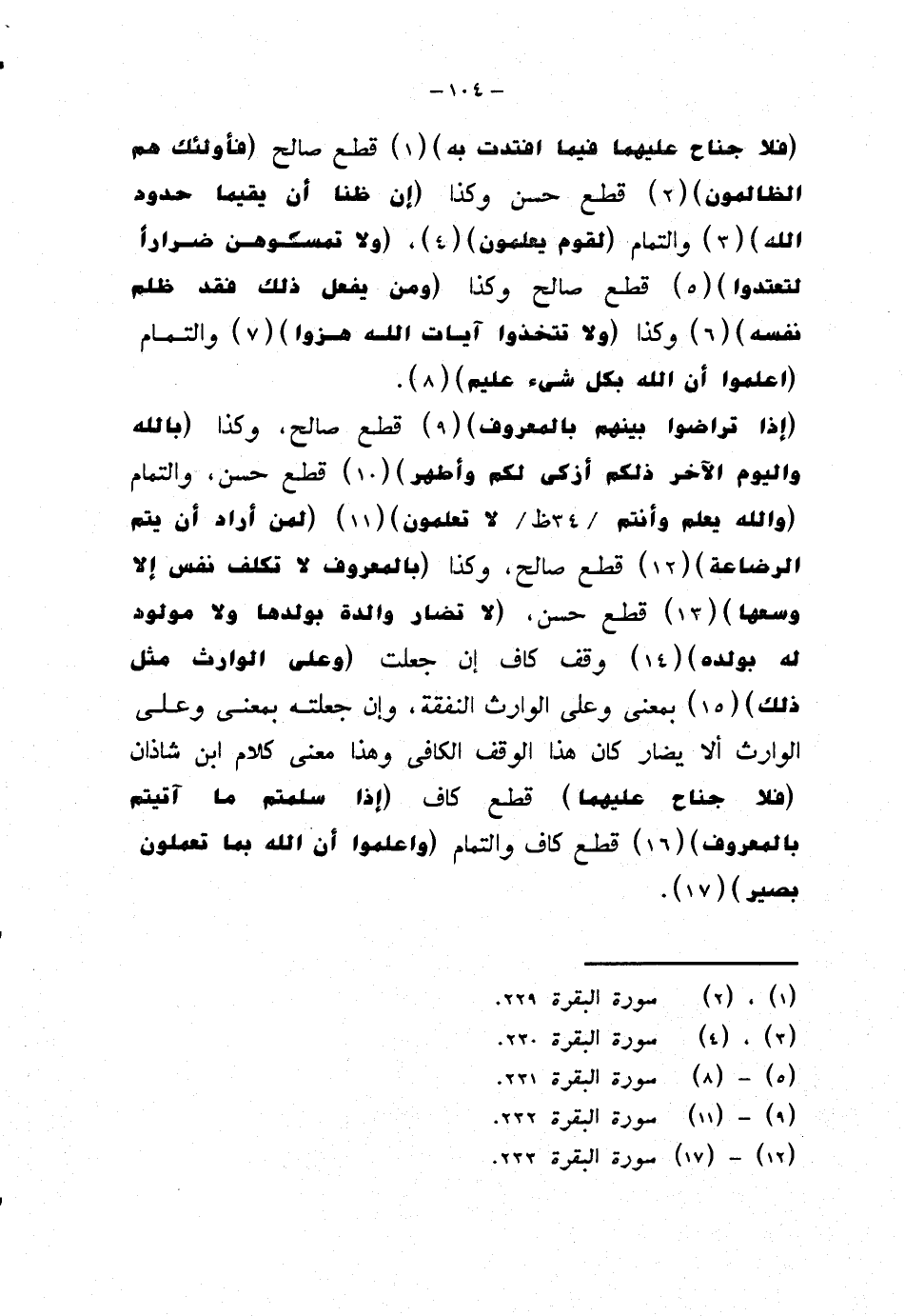 {إذا تراضوا بينهم بالمعروف} قطع صالح، وكذا {بالله واليوم الآخر ذلكم أزكى لكم وأطهر} قطع حسن، والتمام {والله يعلم وأنتم لا تعلمون} {لمن أراد أن يتم الرضاعة} قطع صالح، وكذا {بالمعروف لا تكلف نفس إلا وسعها} قطع حسن، {لا تضار والدة بولدها ولا مولود له بولده} وقف كاف إن جعلت {وعلى الوارث مثل ذلك} بمعنى وعلى الوارث النفقة، وإن جعلته بمعنى وعلى الوارث ألا يضار كان هذا الوقف الكافي وهذا معنى كلام ابن شاذان (فلا جناح عليهما) قطع كاف {إذا سلمتم ما آتيتم بالمعروف} قطع كاف والتمام {واعلموا أن الله بما تعملون بصير}.
