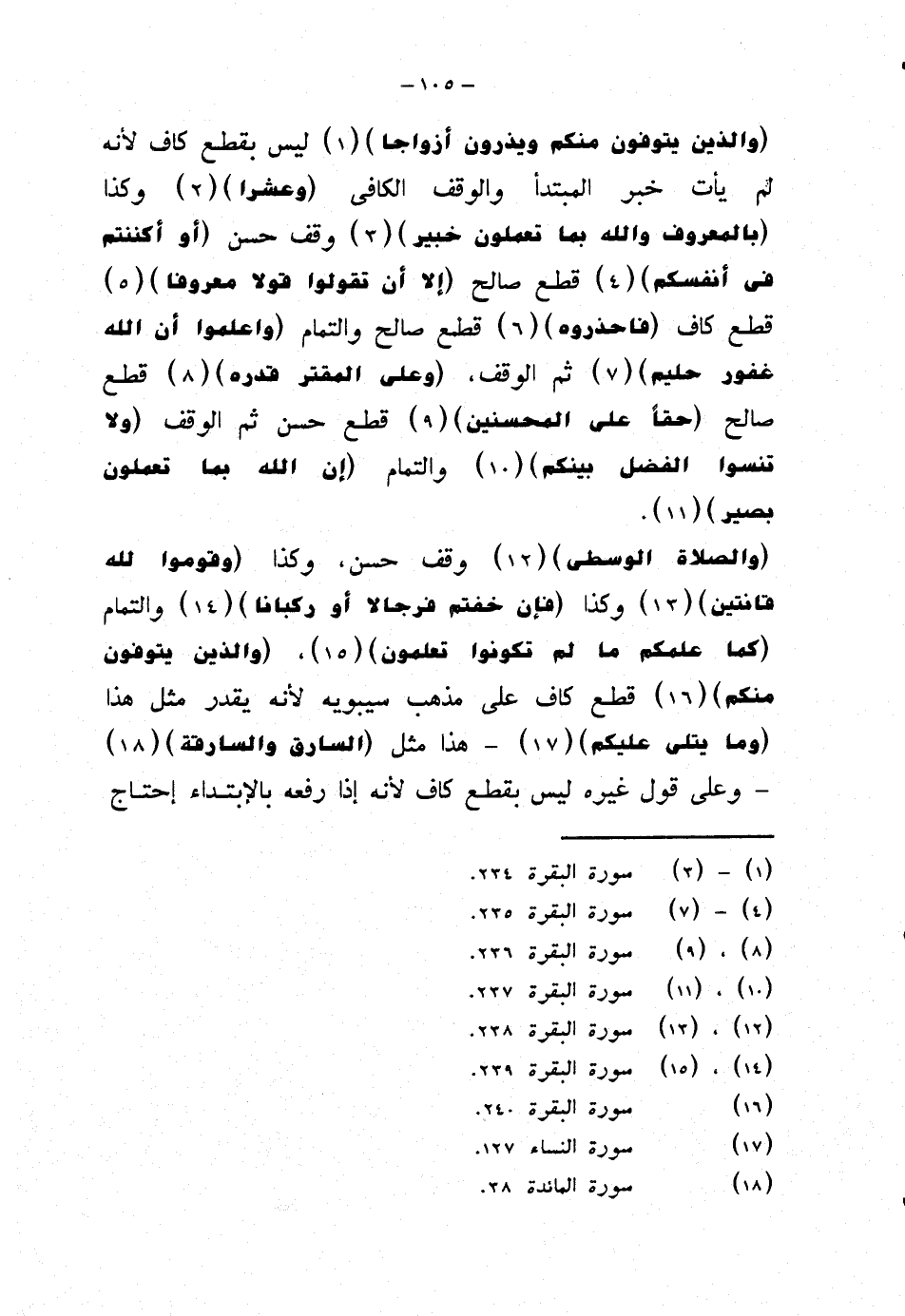 {والصلاة الوسطى} وقف حسن، وكذا {وقوموا لله قانتين} وكذا {فإن خفتم فرجالا أو ركبانا} والتمام {كما علمكم ما لم تكونوا تعلمون}، {والذين يتوفون منكم} قطع كاف على مذهب سيبويه لأنه يقدر مثل هذا {وما يتلى عليكم} - هذا مثل {السارق والسارقة} - وعلى قول غيره ليس بقطع كاف لأنه إذا رفعه بالابتداء احتاج