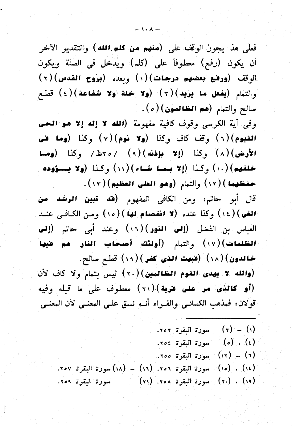 قال أبو حاتم: ومن الكافي المفهوم {قد تبين الرشد من الغي} وكذا عنده {لا انفصام لها} ومن الكافي عند العباس بن الفضل {إلى النور} وعند أبي حاتم {إلى الظلمات} والتمام {أولئك أصحاب النار هم فيها خالدون} {فبهت الذي كفر} قطع صالح.