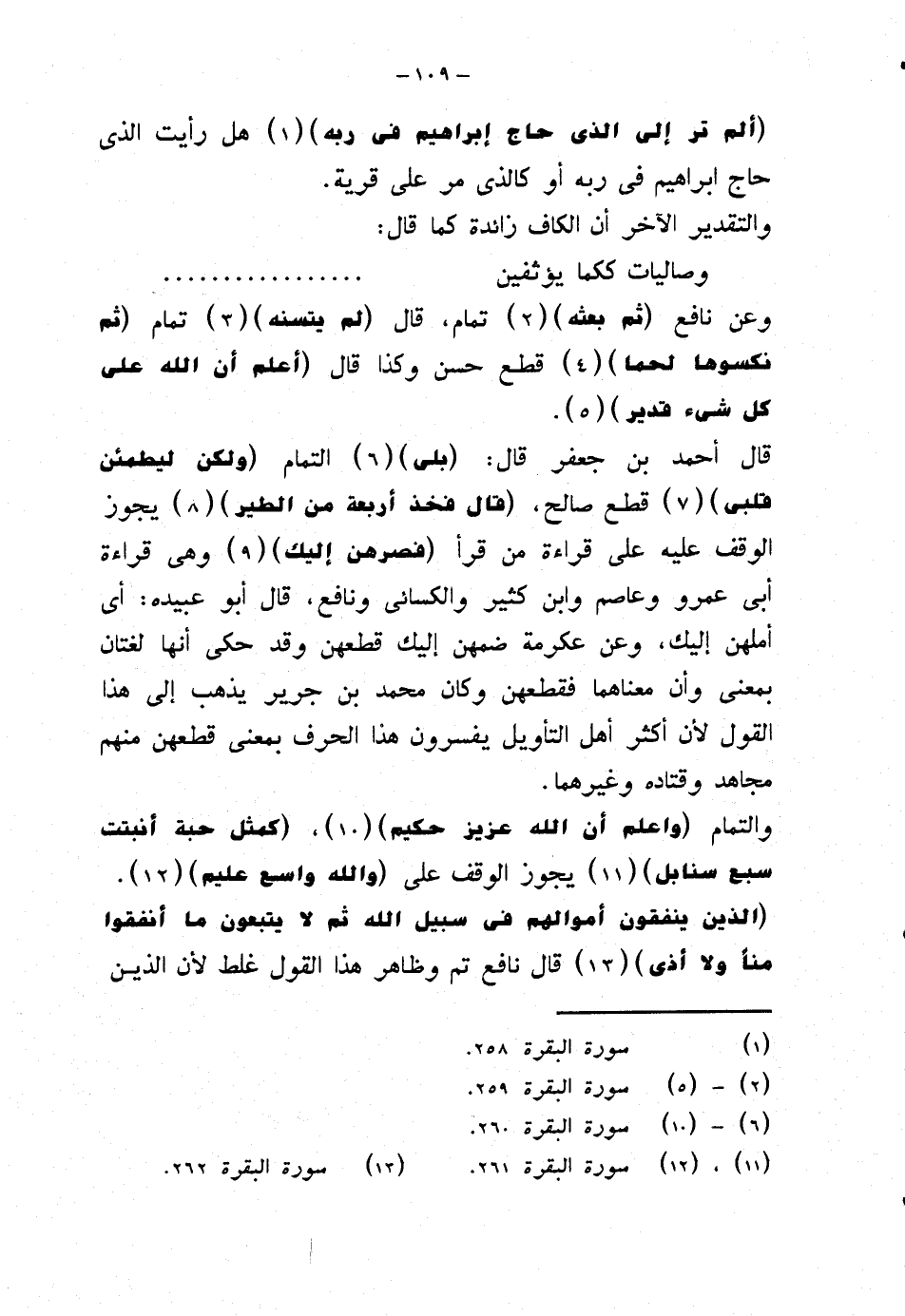 قال أحمد بن جعفر قال: {بلى} التمام {ولكن ليطمئن قلبي} قطع صالح، {قال فخذ أربعة من الطير} يجوز الوقف عليه على قراءة من قرأ {فصرهن إليك} وهي قراءة أبي عمرو وعاصم وابن كثير والكسائي ونافع، قال أبو عبيده: أي أملهن إليك، وعن عكرمة ضمهن إليك قطعهن وقد حكى أنها لغتان بمعنى وأن معناهما فقطعهن وكان محمد بن جرير يذهب إلى هذا القول لأن أكثر أهل التأويل يفسرون هذا الحرف بمعنى قطعهن منهم مجاهد وقتاده وغيرهما.
