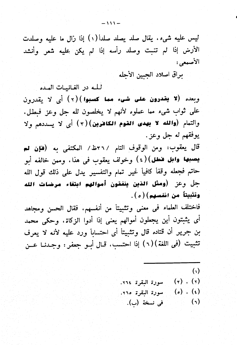 قال يعقوب: ومن الوقوف التام المكتفي به {فإن لم يصبها وابل فطل} وخولف يعقوب في هذا، وممن خالفه أبو حاتم فجعله وقفًا كافيًا غير تمام والتفسير يدل على ذلك قول الله جل وعز {ومثل الذين ينفقون أموالهم ابتغاء مرضات الله وتثبيتًا من أنفسهم}.